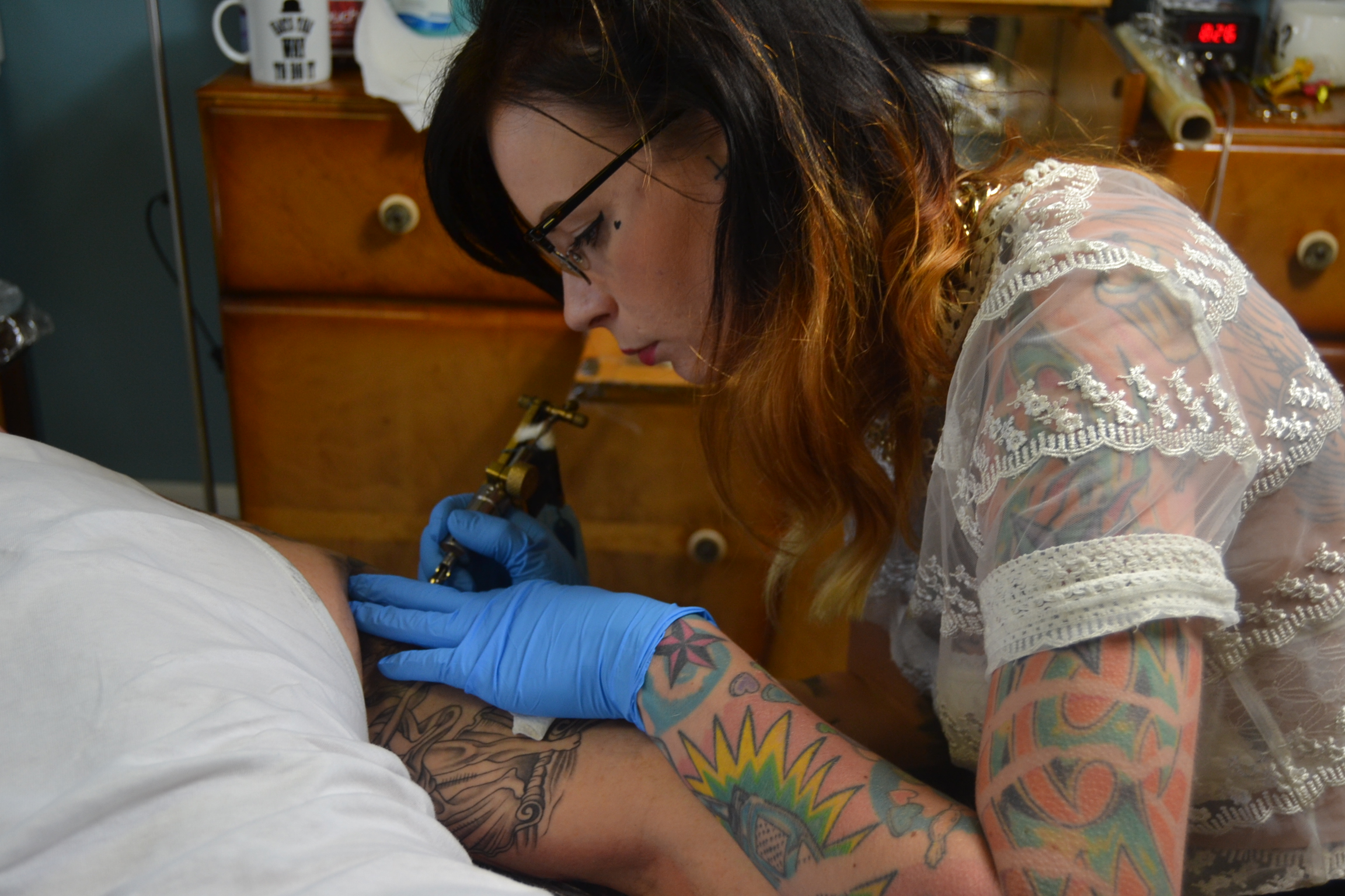 Liverpool born Natz has been tattooing for 5 years, starting when she was 17. ” I wanted to do it since I was 8, I was a really weird child so I didn’t have a choice, I had to do this! Before that I wanted to be a farmer. Its a really hard industry to get into, there are no art colleges or courses to do it, you need an experienced tattoo artist who’s willing to teach you the basics of hygiene, sterilisation, set up, needles, ink, body parts and skin differences, aftercare… and you have to be able to draw! You practice on fruit, pig skin and yourself! My first tattoo was of a tooth I did on my ankle!” She says ” people are becoming more open minded, its becoming more of an art form, we do custom designs for everyone, we never use them again, they’re unique and one of a kind.. Its the type of job where you’re always getting better, always improving, you’re never doing the same thing.. and I never shut up so I can talk to my hearts content!”