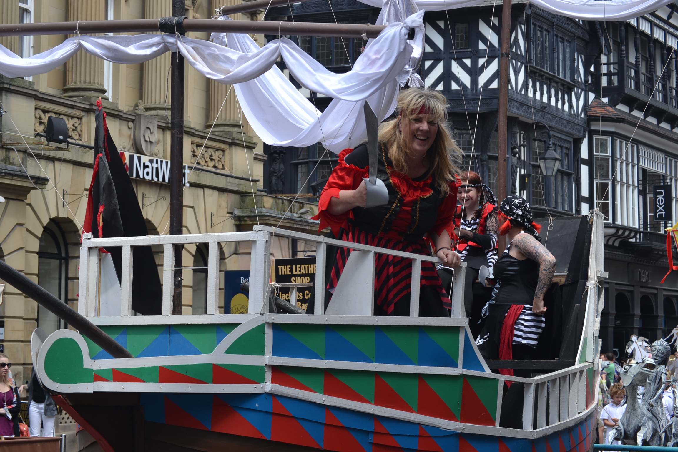 We closed with some general thoughts about her life and involvement in the Midsummer parade. She currently works as a maths tutor for gifted children with special needs, as well as writing maths textbooks. She is a big fan of @Shitchester and describes it as the “funniest thing since I nearly knocked over a druk Gavin Henson on Pepper Street!” Of the parade she says ” I painted Russell Kirk last year and he asked me to get involved.. I demanded that I be a pirate because I didnt want to be anything else. I screamed my head off at the crowds, the trouble is when the pirate ship stops you have to be careful what you say! I did threaten to cut people’s heads off and eat children, they loved it! It was 2 days running and it was exhausting, but now I can get through the barriers on Northgate street without sayong a word!” she laughs.