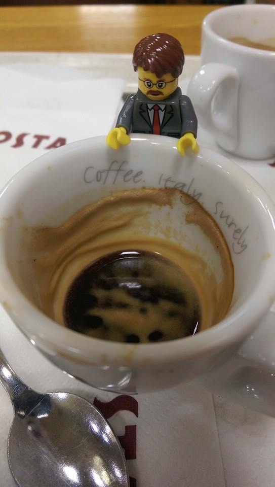 The newest and most controversial Costa opened recently directly opposite the established independent Barista’s Coffee. The venue always seems busy with a mix of clientele. I am happy to see electrical charging points offer a chance to recharge for busy tweeters. Due to minor chest pains I opt for a kids juice water combo drink. It is not that nice. No receipt given by staff but they all seemed very happy and positively engaging with customers. Lego Mike Jones takes a mud bath in Rob’s latte. Armchairs at the back are great seating for people that fancy themselves as kings or as Jack says “Kim Jong Il would look good in that chair”. Plenty of seats outside for people watching and /or facing down your enemies. Existentialism rating is high at this point.