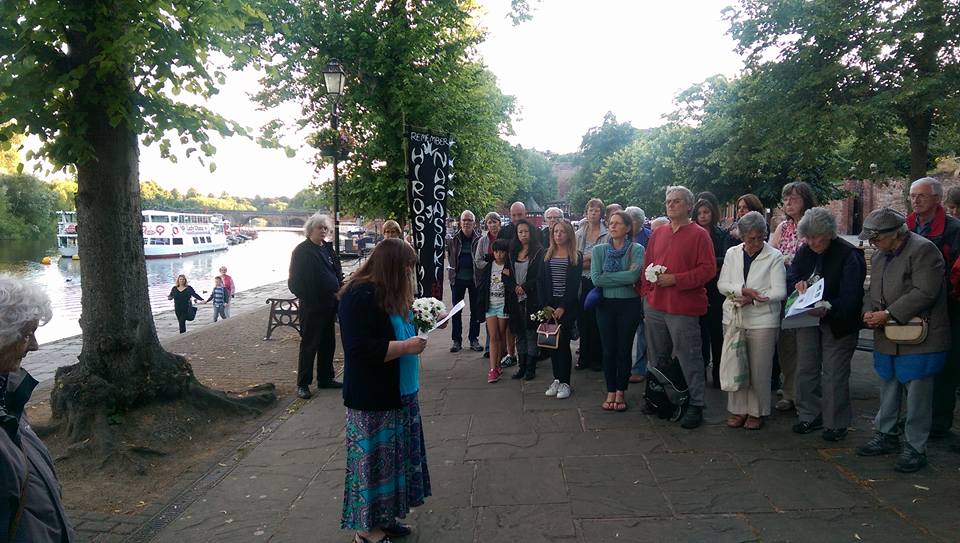 A crowd of over 60 people gathered on a calm Summer’s evening to remember the events of 70 years ago when nuclear bombs were dropped on Hiroshima and Nagaski, ending WW2. The event which takes place every year is organised by the Chester branch of CND. The host stressed that it was a non political event with the sole intention of remembering those who died and suffered in the bombs, as well as those that were damaged or injured for the rest of their lives. The bombs resulted in a death toll of over 200,000 people, the majority of whom were civilians.