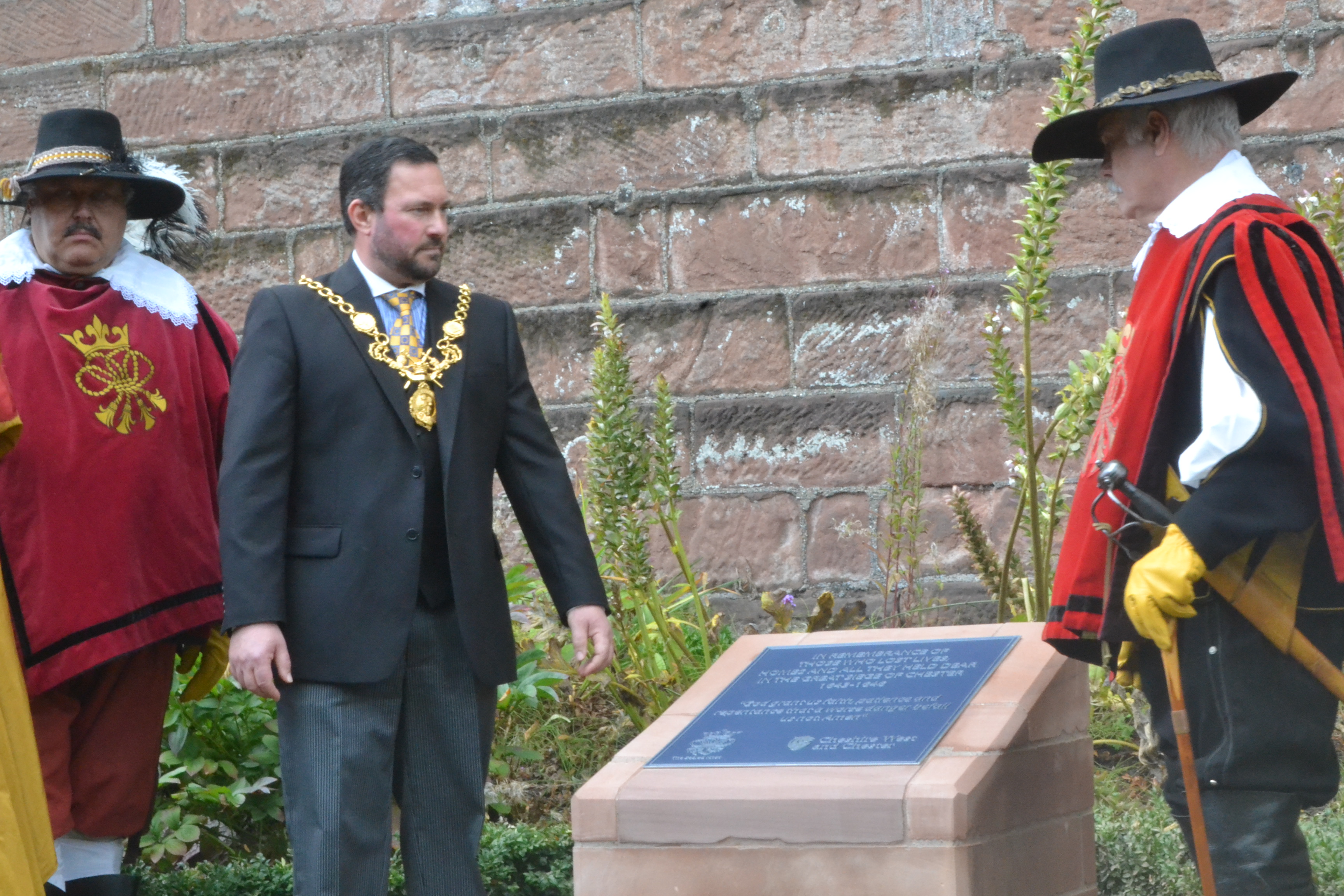 At the Town Hall the Lord Mayor welcomed the Sealed Knot and the various regiments to the city. “It’s a great pleasure to see you all.. part of the huge wealth, depth and breadth of history that we have as a city here in Chester, the envy of many” he said , before leading the parade back through town to the Roman gardens. Here a plaque was unveiled to those that died on both sides of the Siege- the first time the city has formally commemorated the war dead . Following a short religious dedication and prayer, Mayor Deynem then gave a speech remembering the siege and also the battle of Rowton, “We can only begin to imagine the trials that the residents of Chester went through during that siege.” he said. During the real siege, Cestrians were bombarded by cannons and many starved. They often sought shelter in the under crofts, now the modern-day shops at street level. With these being wooden, as soon as the cannonball hit, fire ensued causing more death and destruction.