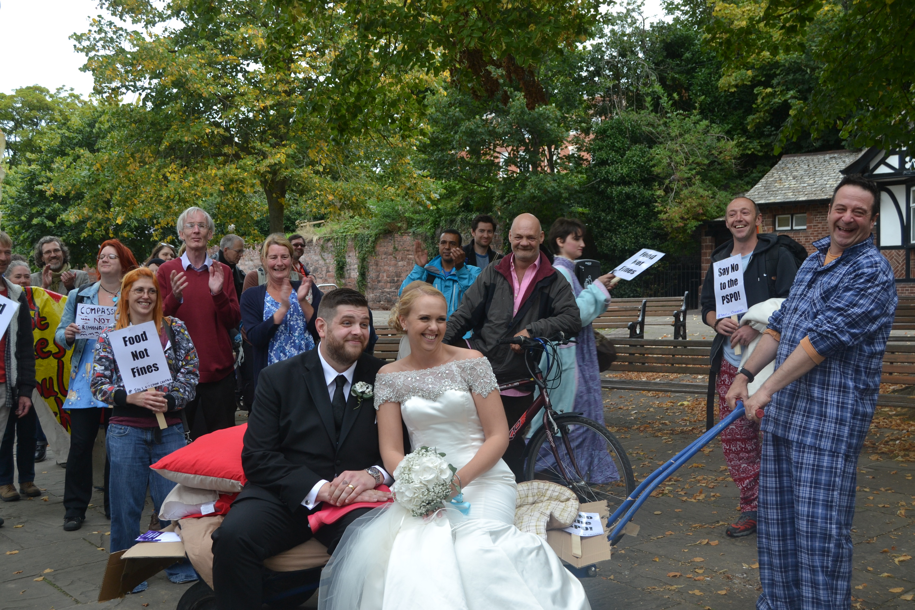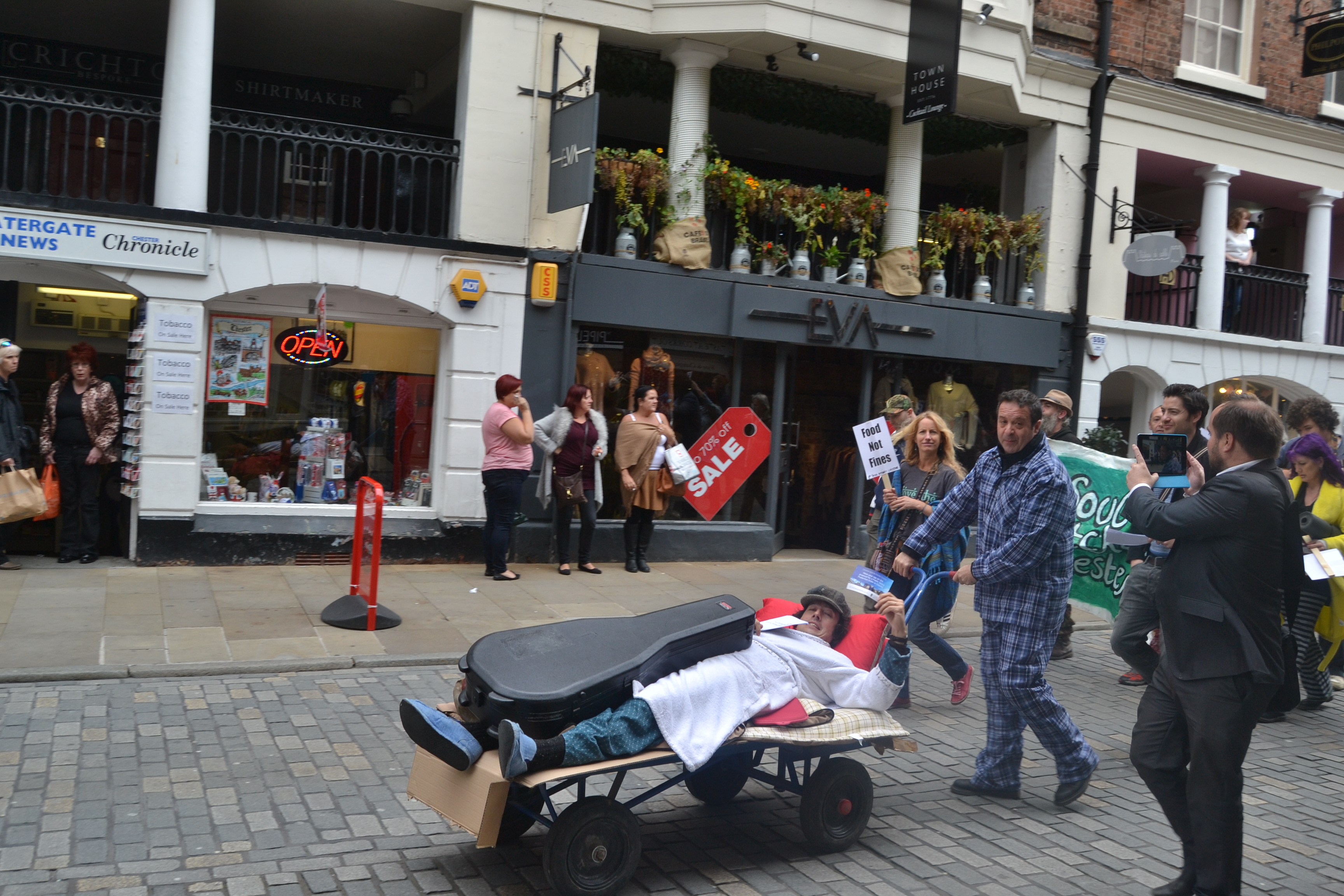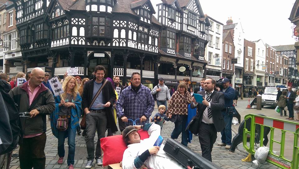 Comedian Mark Thomas organised a protest in Chester today against the new Public Space Protection Order (PSPO) which the council are currently consulting upon. The controversial PSPO has been poorly received on social media with over 7000 people petitioning against the proposals which cover rough sleeping, busking , bird feeding and legal highs https://www.change.org/p/cheshire-west-and-chester-council-don-t-make-life-harder-for-the-homeless-don-t-criminalise-your-buskers