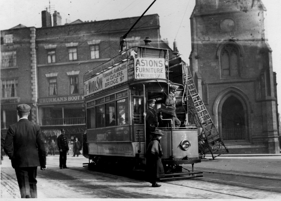 The trams were single track at the clock. John then showed us some rare archive footage of the trams operating in 1929 . The wonderfully nostalgic clip from the North West film archive shows busy streets, a policeman directing traffic, WHSmiths with the same sign they use today… “I often think.. if you could just go back in time for one day and see what it was like” mused one of the tour guests. John says that, without contacting a Time Lord , the best way of experiencing what it was like is to ride on the tram at the Black country museum in Wolverhampton. The tram in use was built by the same company as the Cestrian fleet and survived the following years by being used as coffin store for an undertakers.
