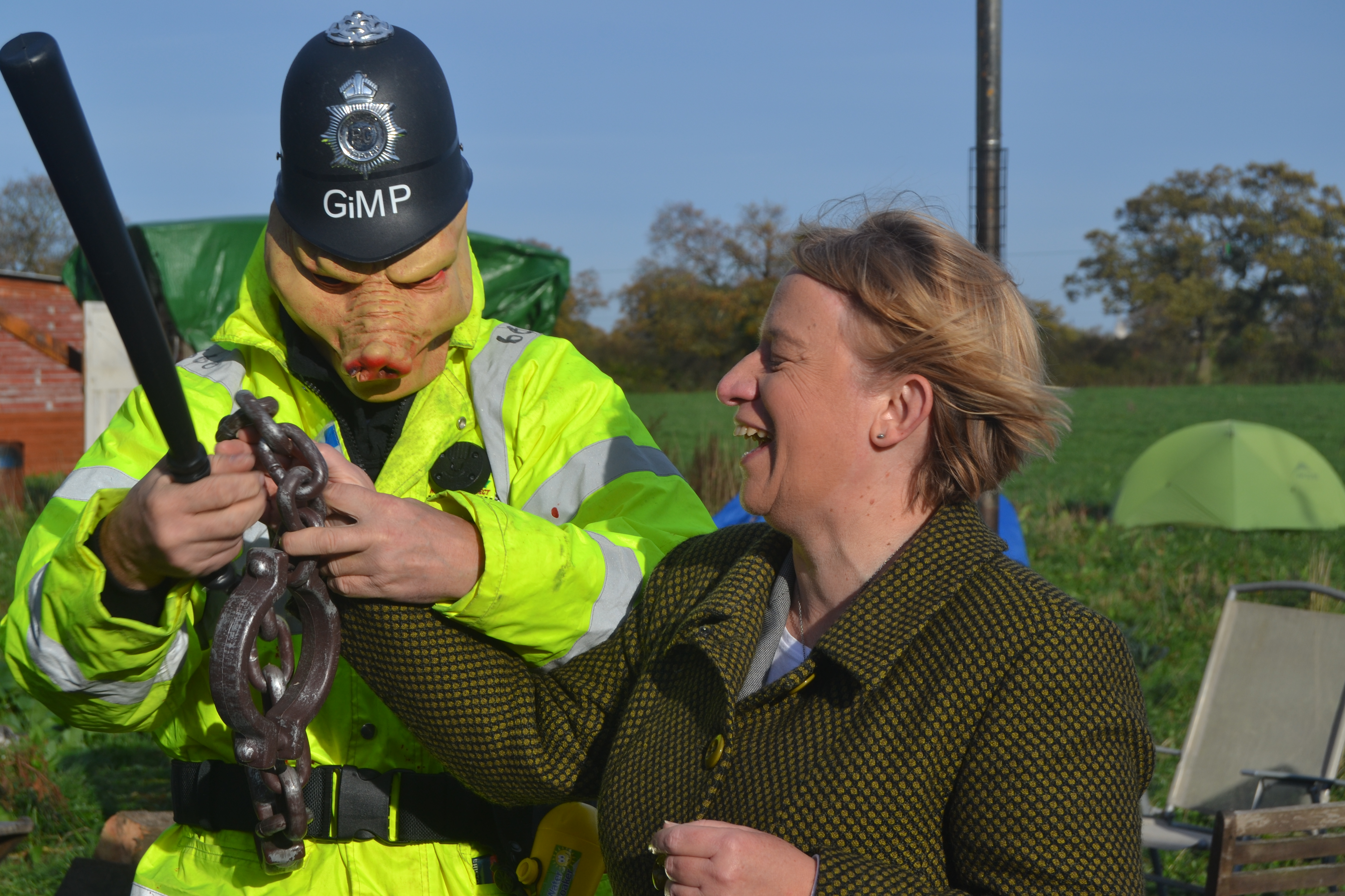 She rejected industry claims that fracking would have stronger regulation in the UK. “Its a cowboy industry, it operates in America with virtually no rules and they’re bringing that technology, that culture here to Britain” Her speech was interrupted by an anti police protester wearing a pig mask labelled “Gimp” which caused some amusement.