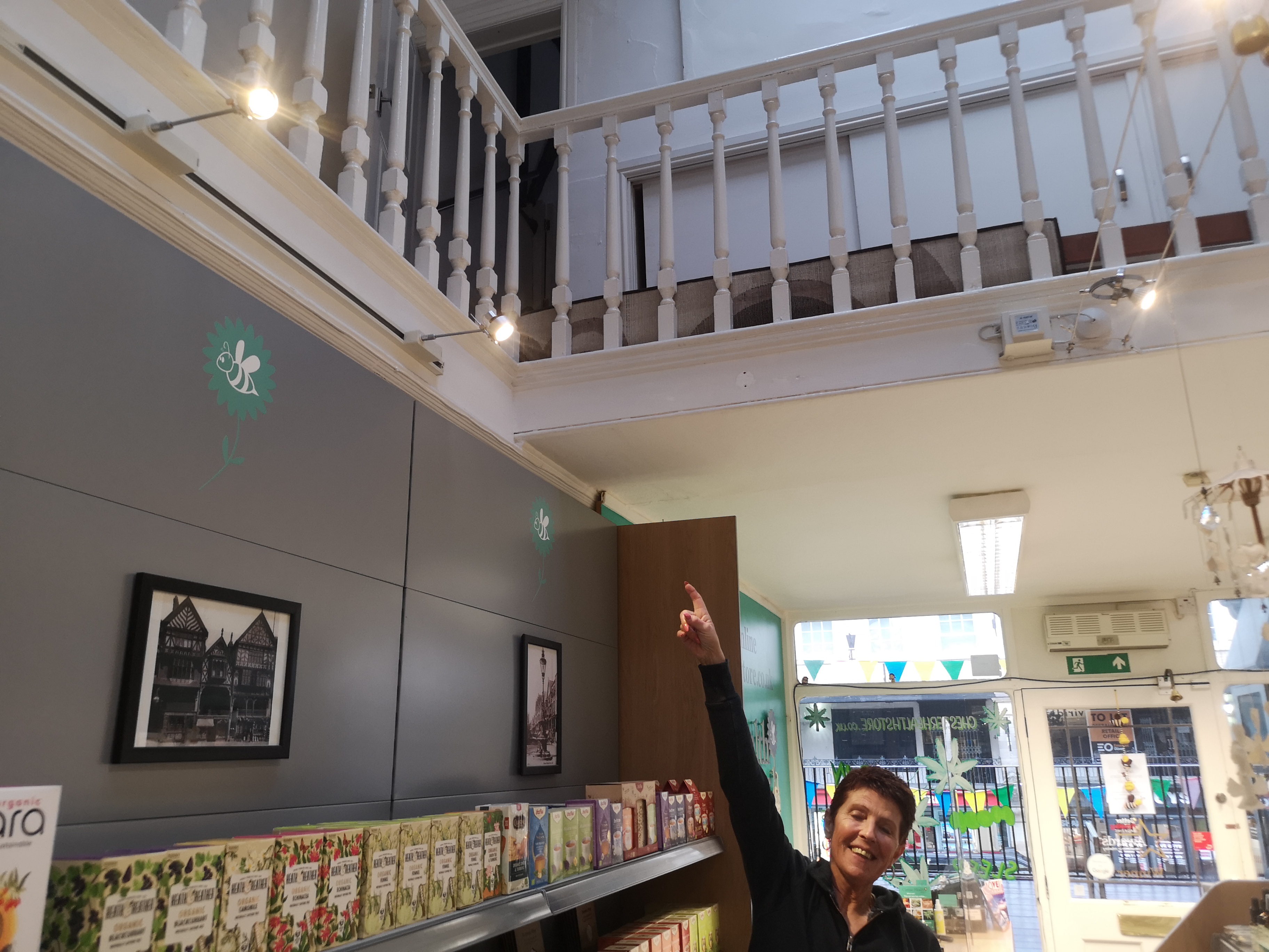 My next stop is Chester Health Store, the owner Niki being a long term friend and supporter. On the way I pass a dejected hospitality business owner smoking a fag in his doorway ( the sun having suddenly faded into rain) . Meanwhile a woman shelters underneath the canopy of the empty Cafe Rouge and a policewoman covers her head with an iPad in a folder. A confident street photographer would have been snapping away but I’m not so you’ll have to make do with the descriptions. I wait outside the Health shop as two suited young men talk to the owner.