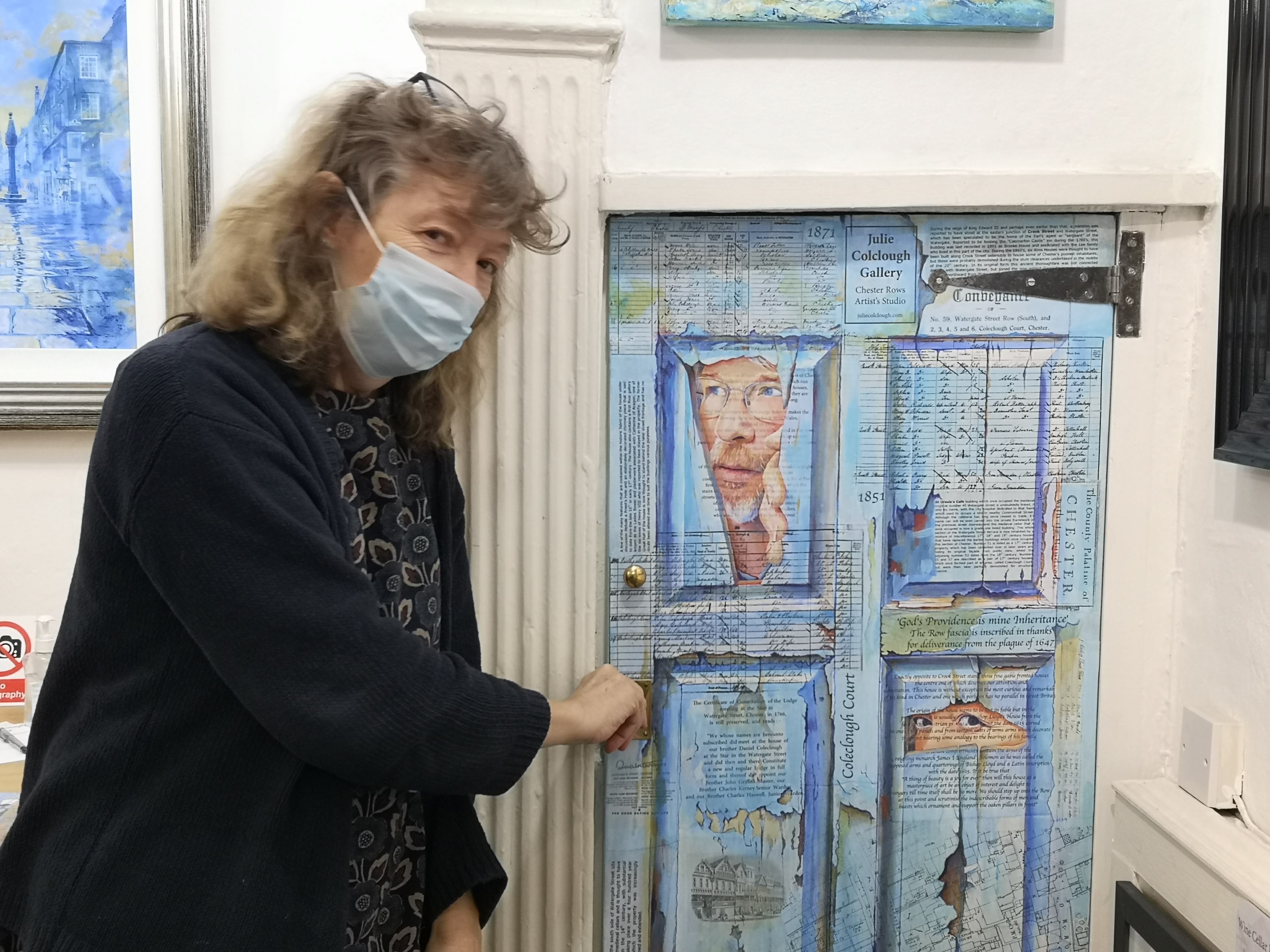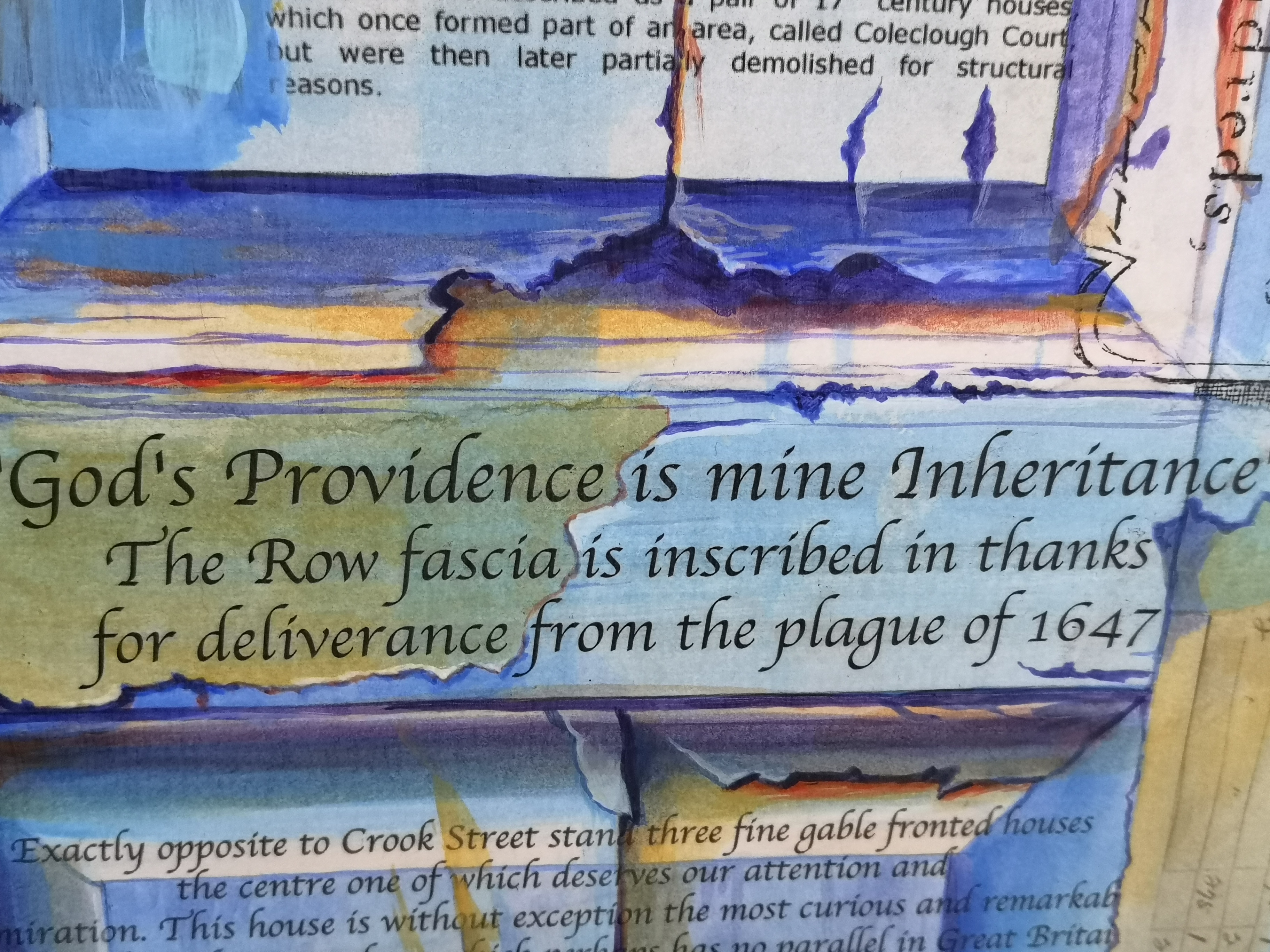 Julie also shows me some artwork painted during the first lockdown which uses a collage technique to show some of the previous residents of the street based on a search of local records. “When we were looking at the old documents, we found lots of Colcloughs, Through the door at the back which goes through our garage was Colclough Court and everyone who lived there was called Colclough!” She also points out the inscription from God’s Providence House , especially relevant in the Pandemic era. Julie says that similarly the Basilica of Santa Maria (Venice) which features in another of her paintings was built to mark the city’s recovery from a Plague outbreak. What will we build when we’ve beaten our own demons?