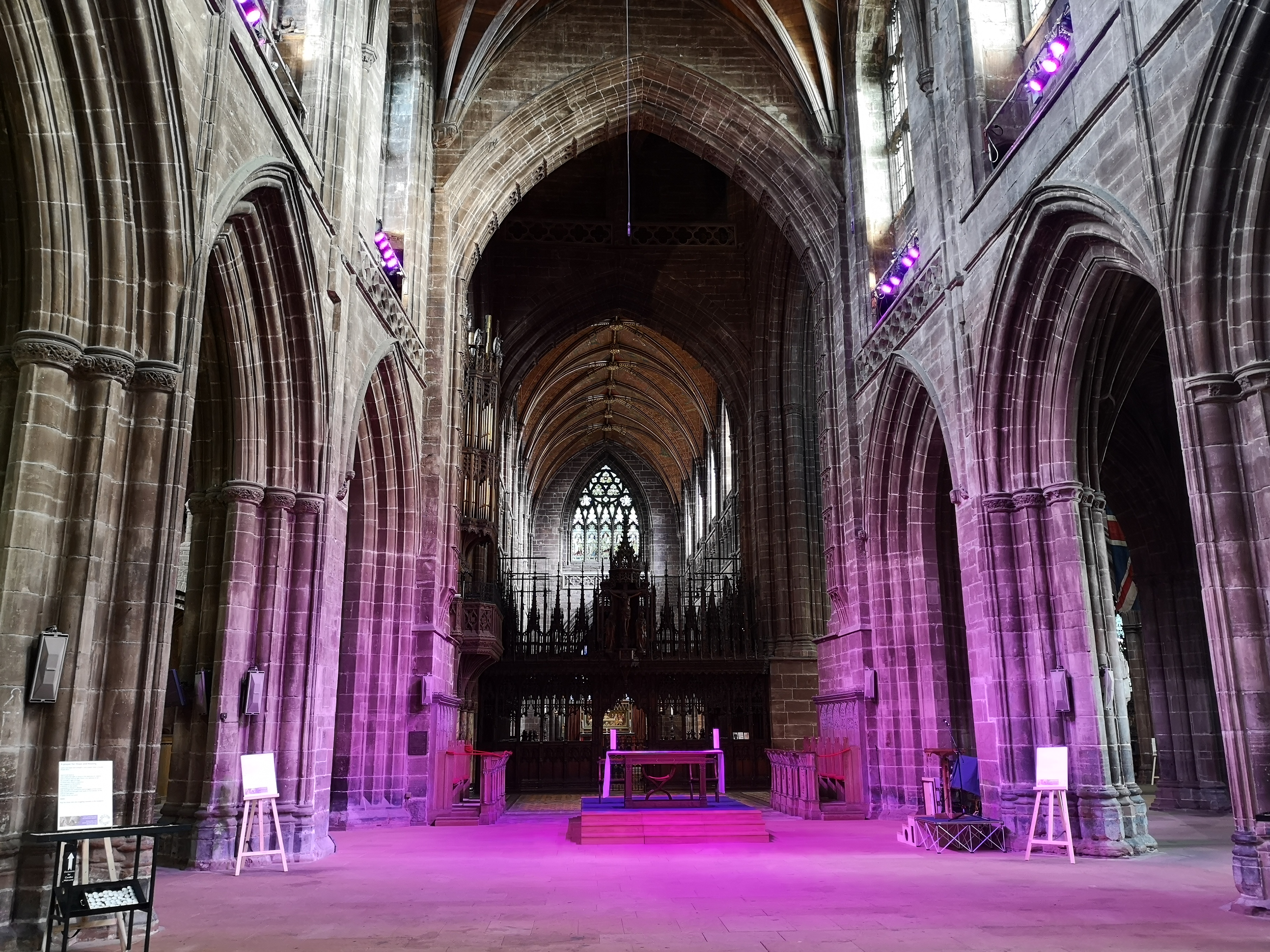 I finish the Grand Day Out at the Cathedral, the nave bathed in a purple light. I asked a member of the Clergy what the light represented, he doesn’t know, but he confirms that the Cathedral will remain open for private prayer from Thursday. I hope I’m back here for the now delayed Christmas Tree festival and other events.