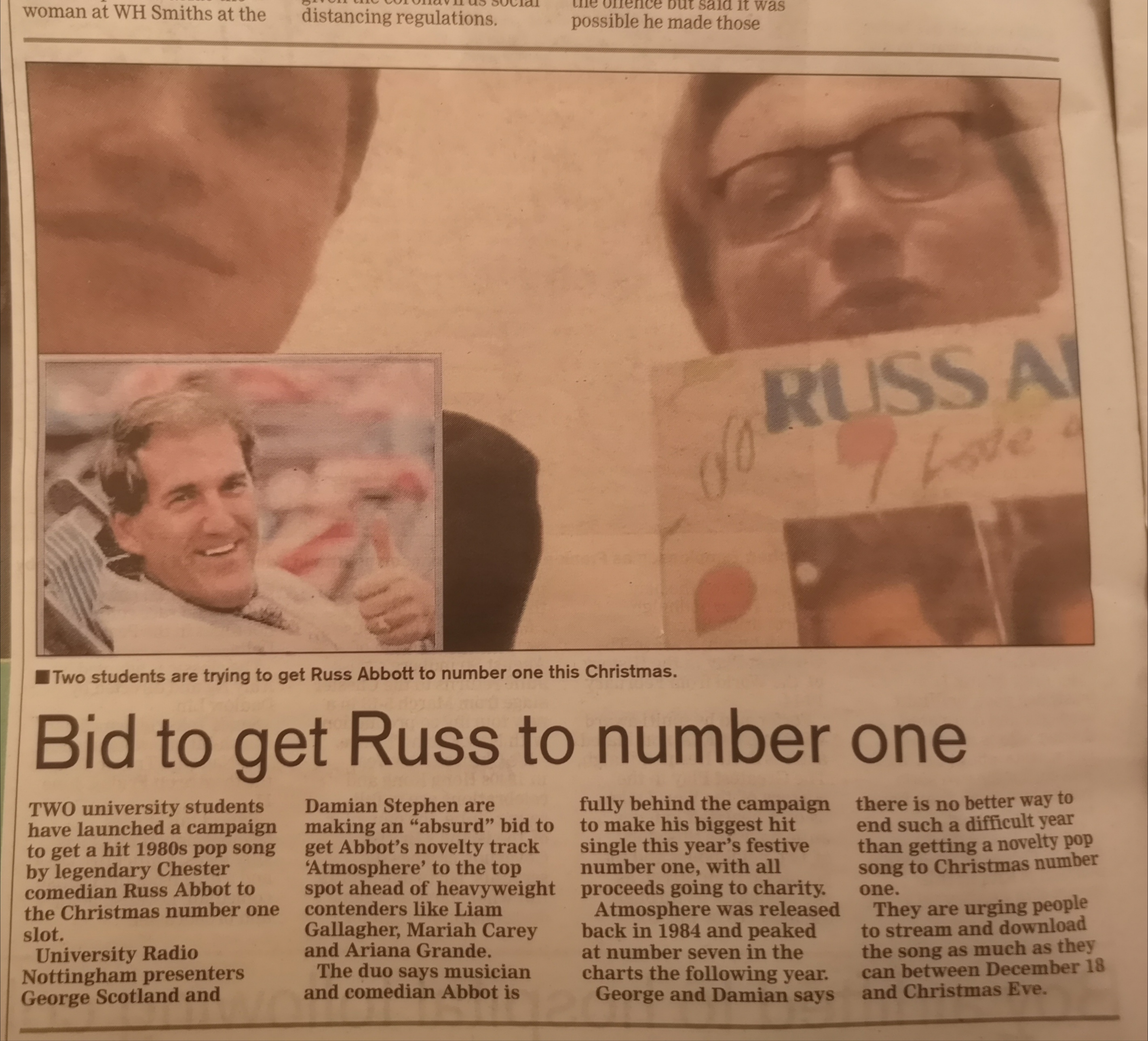 Story of the year was a bid by 2 Nottingham university students to catapult national legend, cult comic and Cestrian Russ Abbot to Christmas number 1 with his 1984 smash hit “Atmosphere” Backed by Russ himself, George Scotland and Damian Stephen ran a valiant media campaign which although unsuccessful , returned Mr Abbot to prominence, raised some funds for mental health charity MIND, and made a lot of people smile.
