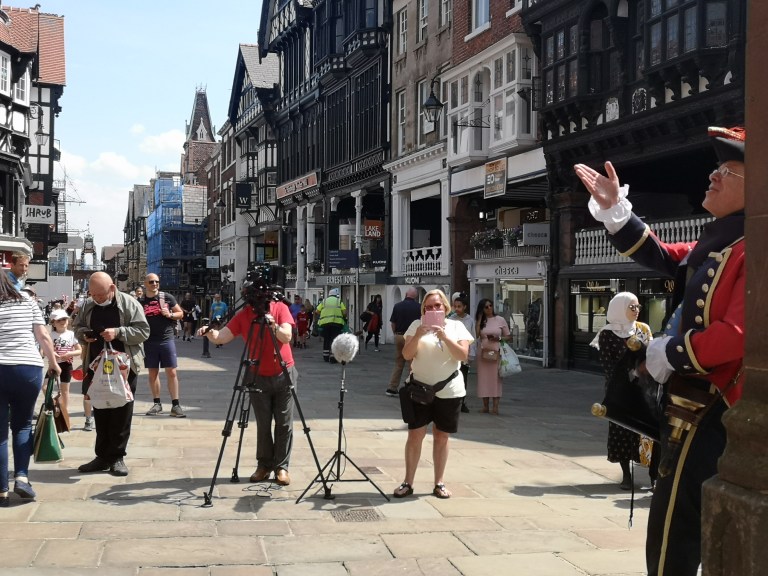 Joking before today’s historic midday proclamation, the Crier commented “I haven’t cried for 15 months because a Town Crier in a mask is a highwayman!” The halt term crowds filling the busy streets were an obvious contrast to the haunting silence of the city during last years spring and winter lockdowns. David had updated his speech to include some references to the pandemic alongside the traditional historical references and jokes, as well as pointing out the locations of key city centre attractions for the benefit of visitors.