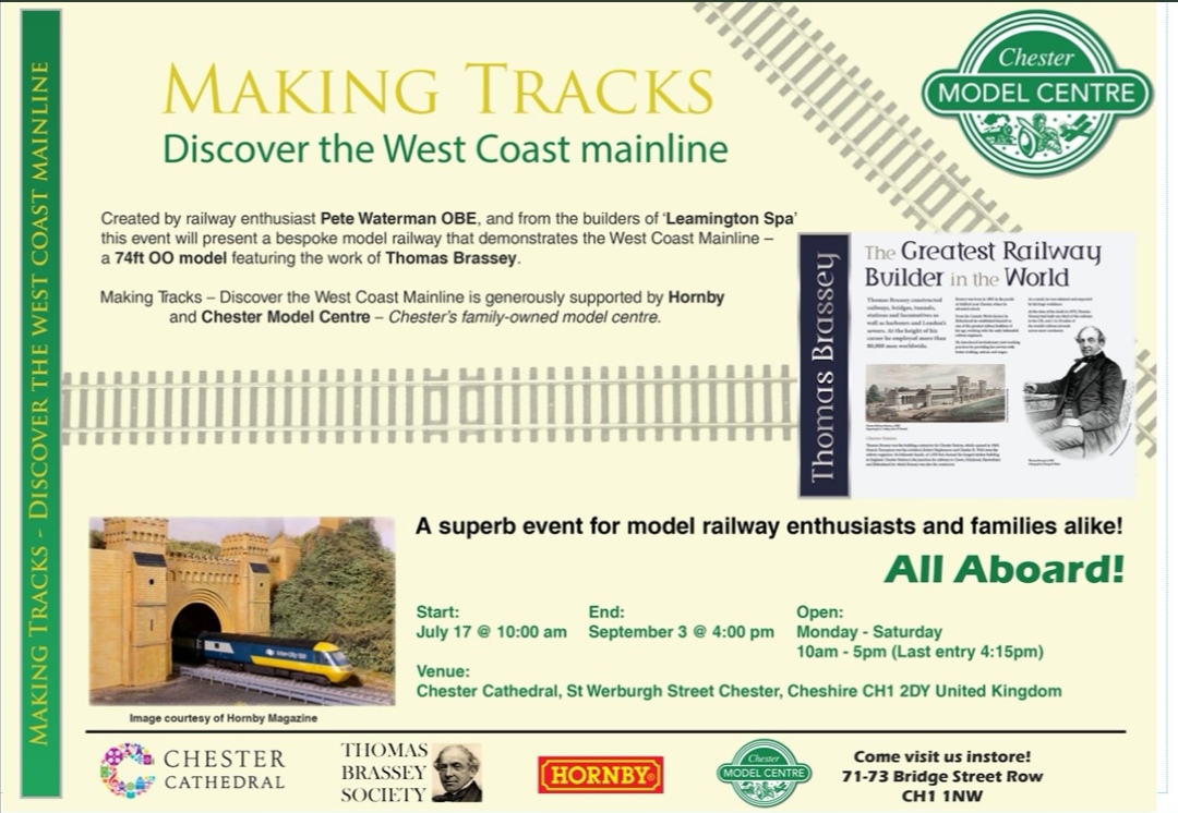 Model railway exhibition Making Tracks opens at the Cathedral on Friday. Running until September the event sponsored by Chester Model Centre showcases the model railway of legendary record producer and railway fan Peter Waterman OBE. The 74ft display features the West Coast Mainline and the work of Thomas Brassey. Tickets cost £2.50. For more details visit Making Tracks – Discover the West Coast Main Line – Chester Cathedral