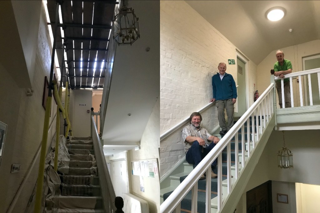 What do theatre set builders do when a theatre is dark? Well, Chester Little Theatre’s set builders, Keith Long, John McGinn and Malcolm Gledhill have not been sitting around during lockdown! When some plaster fell off the ceiling over the main staircase there was the option to make do and mend, or replace the entire ceiling. They chose the latter option and set about erecting a scaffolding platform to remove plaster which had been there ever since 1840 when the building was built.