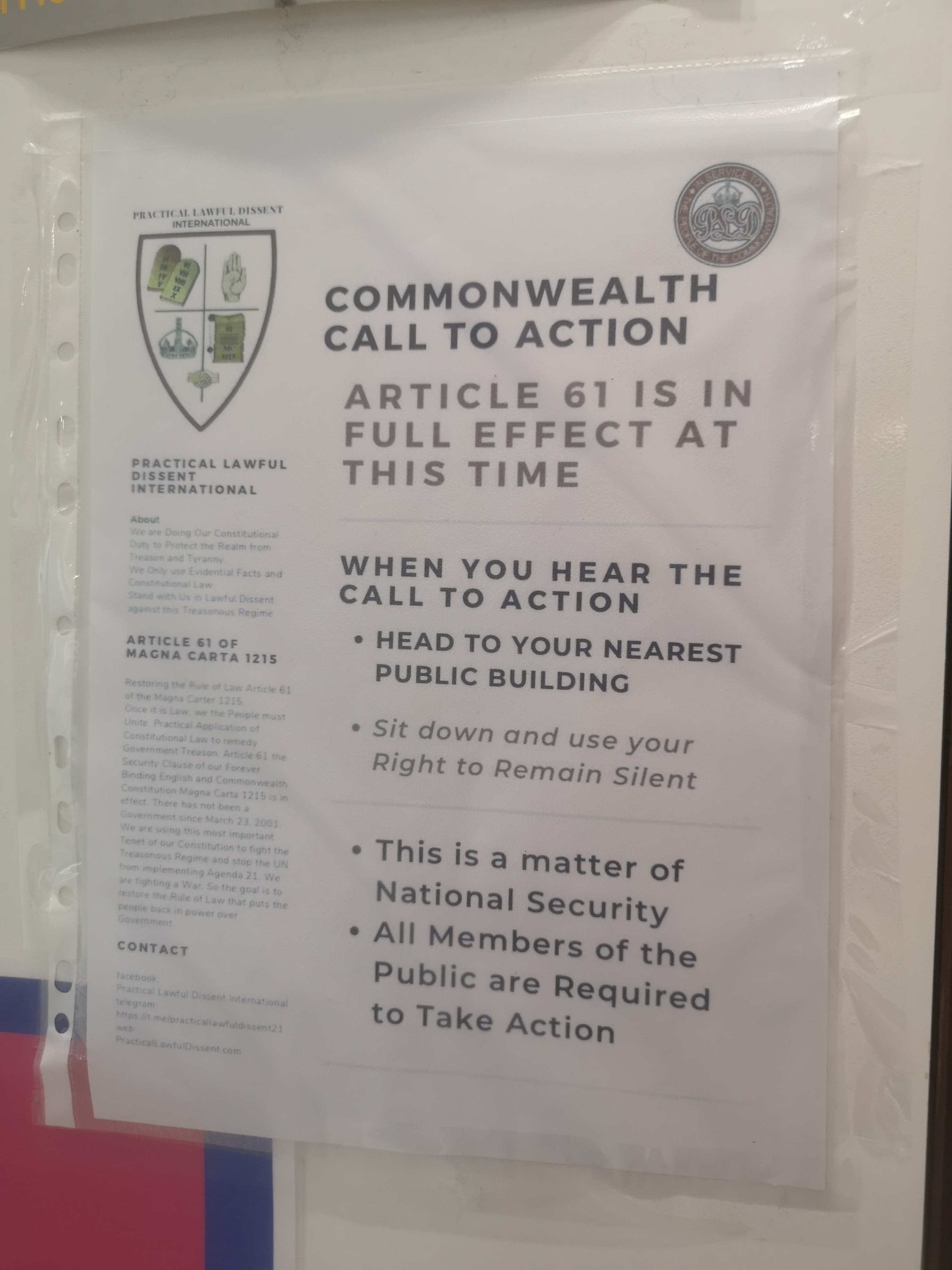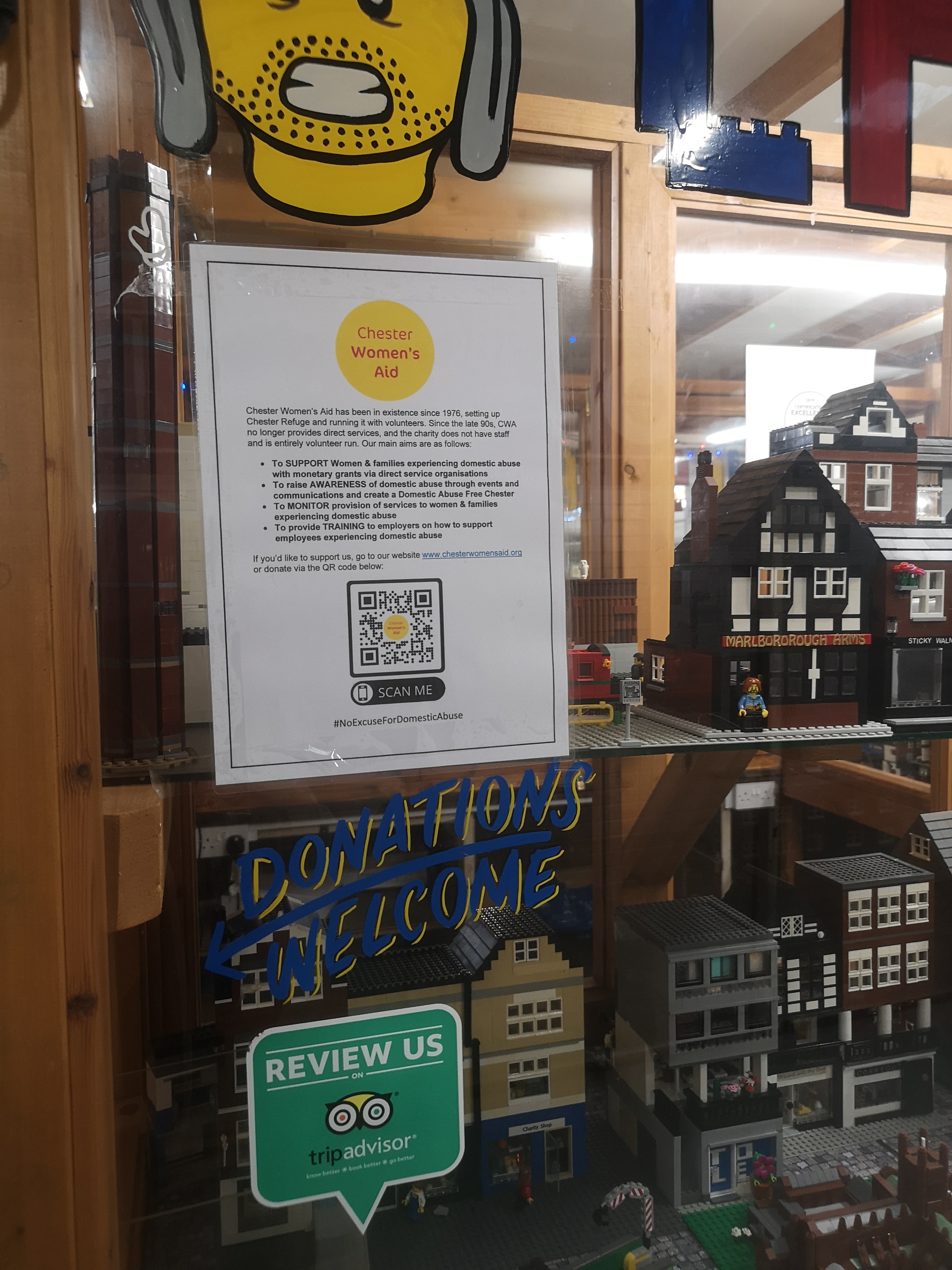 Up on a pillar in the Forum is a presumably unofficial notice urging Cestrians into action over “Article 61” advising peaceful dissent “when you hear the call to action”. The reference to Magna Carta makes me question the motives of the poster and I wonder why Forum staff haven’t spotted it. I call into the market to put up a sign on the Lego display, with Chester Women’s Aid taking over as our charity for the last year in the old premises