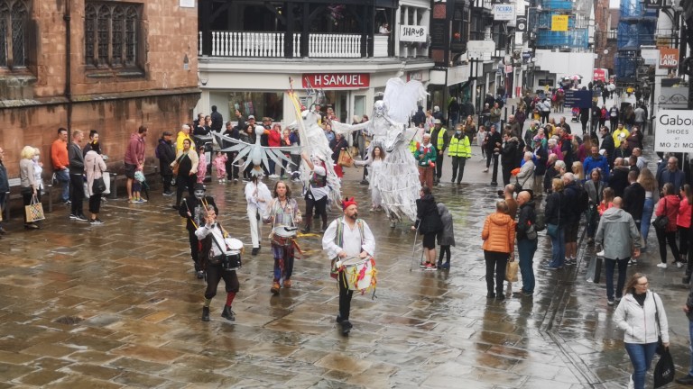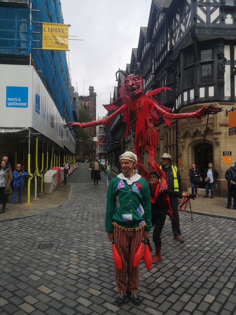 The times of old are back again as I watch the next parade , a giant skeleton puppet interacting with the public, I waiting for the money shot n front of the clock. Other participants include a jester on a children’s tricycle a Devil and a Raven, all no doubt causing the Town Hall preachers extreme angst. The Parade is one of the many things that makes Chester special, drawing and building on our past, involving the community and spreading some happiness. “Its nice to see some smiles again” a tweeter comments.