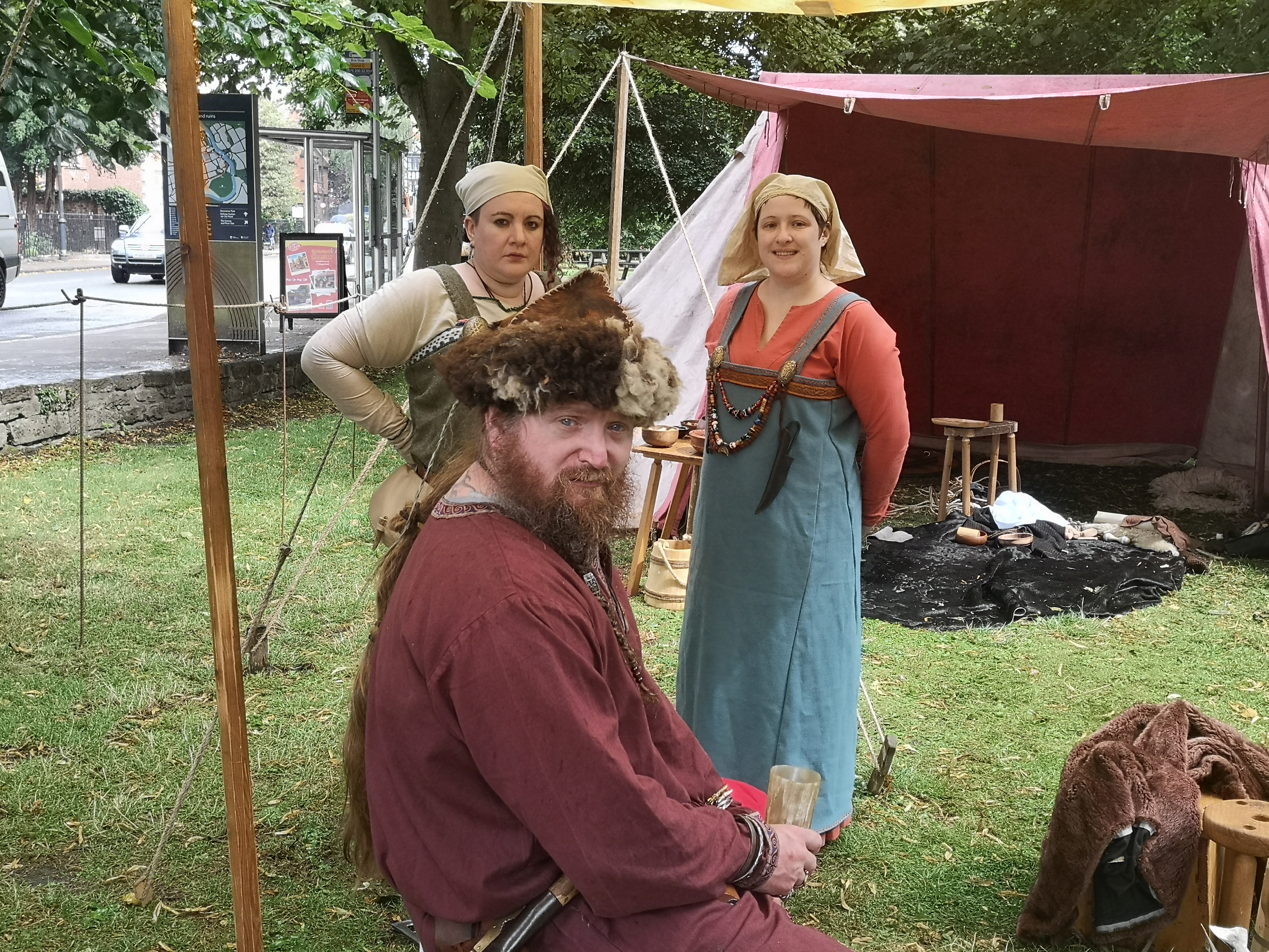Next spot on the days itinerary is a visit to St John’s Church, the city’s original Cathedral, currently undergoing some essential repairs and renovation. Two years at least since I last entered the building its features include the remnants of a medieval painting of St John the Baptist, and the organ played at the coronation of Queen Victoria. The Church also holds some evidence of Viking life in Chester, with stones on display dating from 900AD – 1100AD. More people should come here. Outside a small encampment of modern Vikings have pitched their tents. Unknown Vikings (https://www.unknownvikings.co.uk/about-the-vikings) . The group “aim to show aspects of life in and around the Chester area and beyond between the years 902AD and 1072AD.” . They will return to St Johns on the 11th September.
