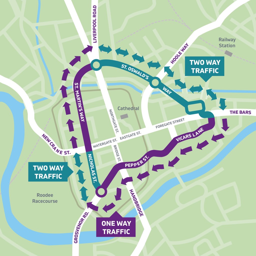 The southbound lane along Nicholas Street between the Watergate Street junction and the Grosvenor Roundabout will allow traffic coming from the Sealand Road direction to turn left or right at the junction with the inner ring road and reduce journey times by removing the need to follow a Clockwise loop to leave the city via the Grosvenor Bridge. The Weaver Street junction with Nicholas Street will also allow for a left or right turn.