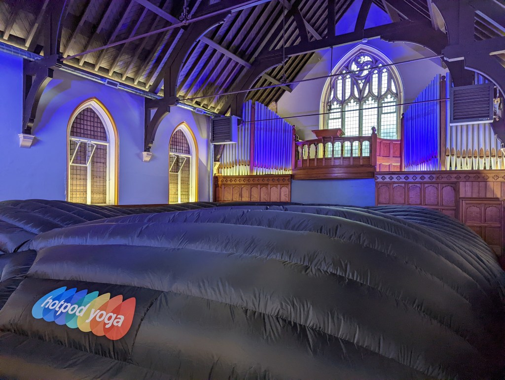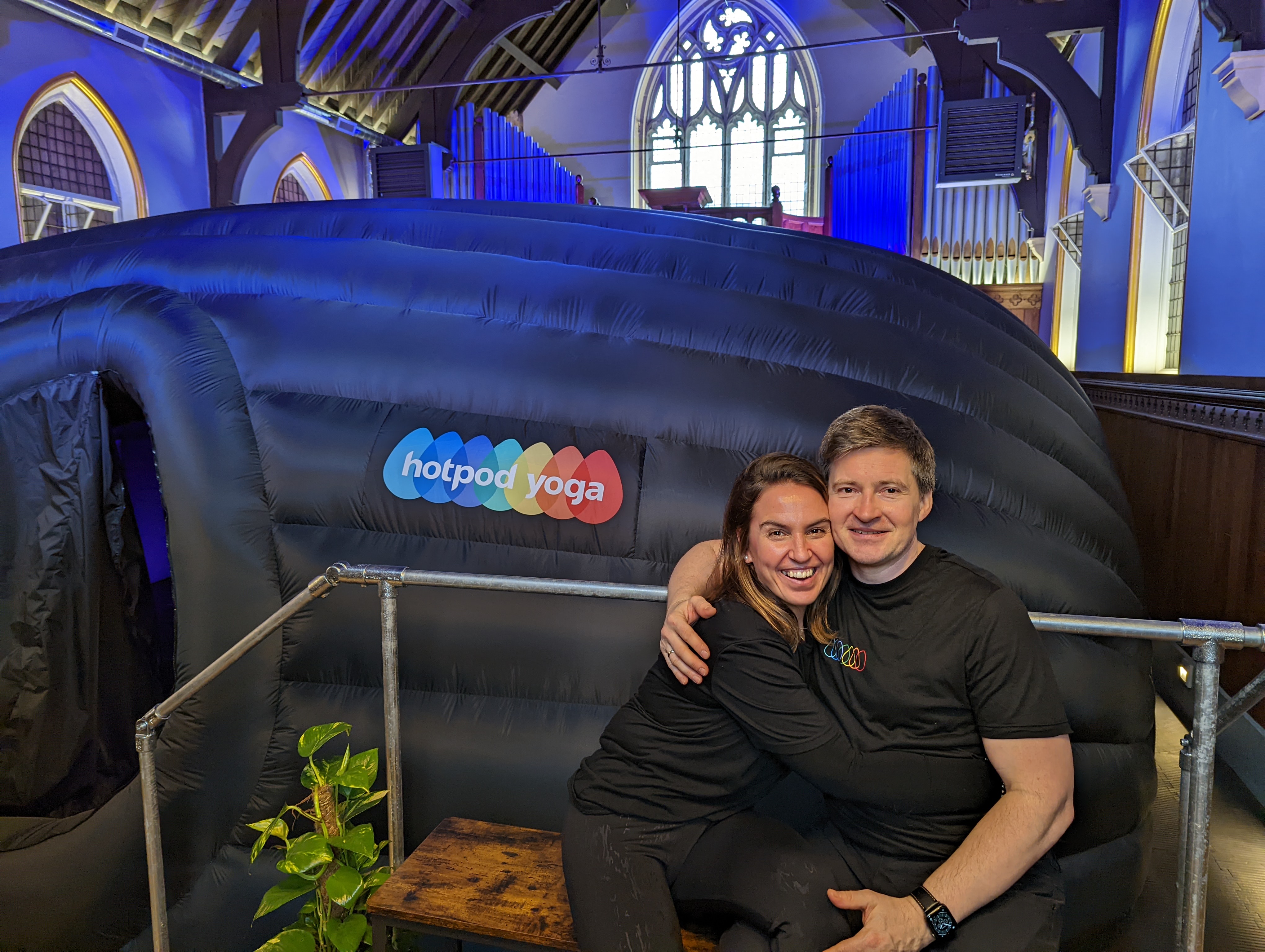 Laira, originally from Brazil, moved to Chester after 17 years in London to follow her dream of running her own yoga studio. ” I have been practicing yoga for seven years now. I was in a broken place, having a hard time and I found it really helpful alongside the physical benefits. I got totally hooked and I loved the heat”. Classes take place inside an inflatable pod which covers the floor area of the sympathetically restored former Church which was founded back in 1893.