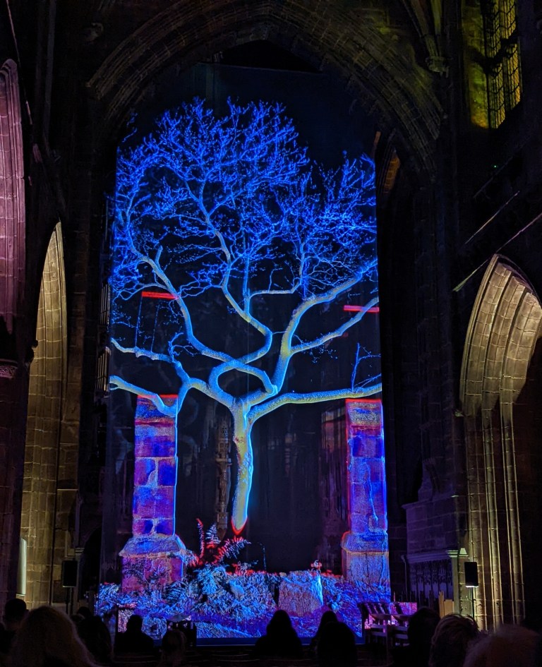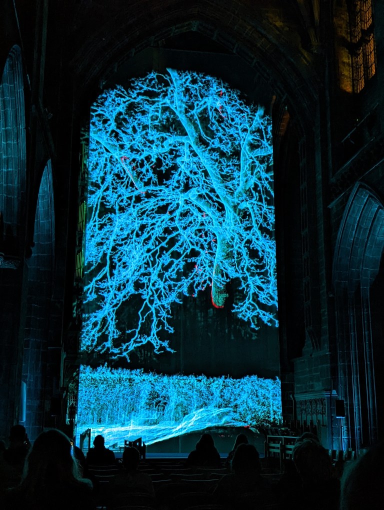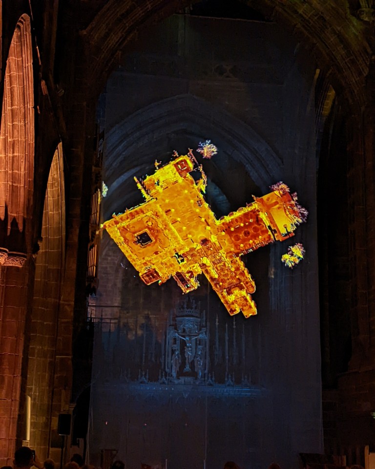 Visitors are then taken on a journey as first the stone pillars are formed and then eventually the full Cathedral. Golden toned images are drawn as if by some giant invisible hand, before gradually fading and merging into the next scene. The hyper realistic imagery based on 3D scans eventually builds into a full model of the Cathedrals floorplan which grows, rotates and then takes flight into the virtual sky. The art gives us insights into the building’s architecture, craftsmanship and layout, at various points taking you beneath the floor and inside one of the pillars. Later scenes of nature based on the surroundings of the Cathedral form, a tree forms, perhaps echoing God’s creation before a virtual bell tower tolls. Ghostly outlines fade into each other as the full Cathedral precinct is revealed, before then fading away once again. The closing water effects are mesmerising, suggesting the non permanence of everything in our world, washed away by the tides of time. For a different view of the installation stand behind the cloth near the choir stalls.