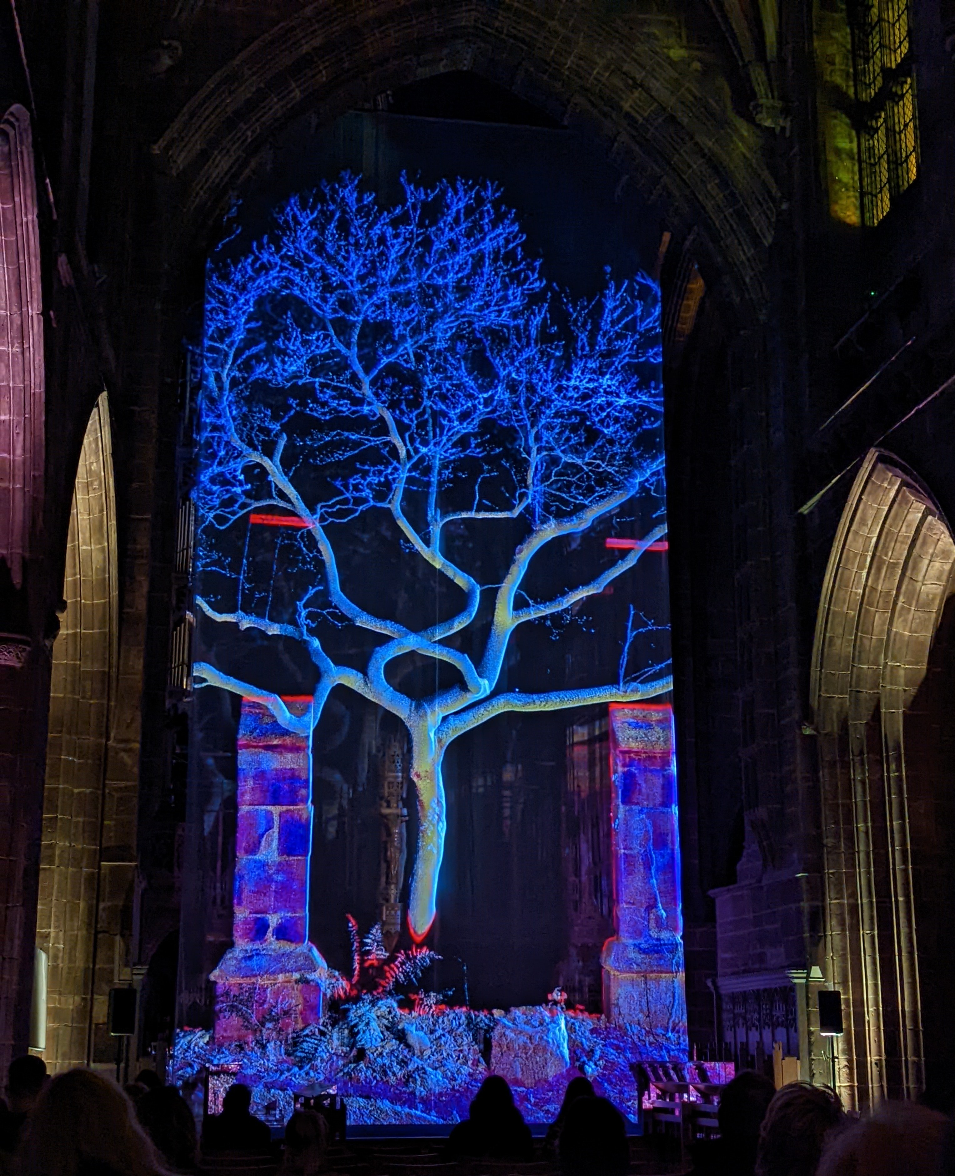 With promotional images giving little away, expectation for this event was high and as soon as darkness fell visitors gathered in the nave to watch the 20 minute looped video projected onto a transparent 17.5 metre high cloth suspended from the vaulted ceiling of the building, with the atmosphere enhanced by atmospheric lighting. The show begins with a column of volcanic fire that forms upon the cloth, projected by technological magic, and suggesting the formation of the rock used to build the Cathedral. The title refers to the period 200 million years ago when this country was a desert found to the south of the Sahara.
