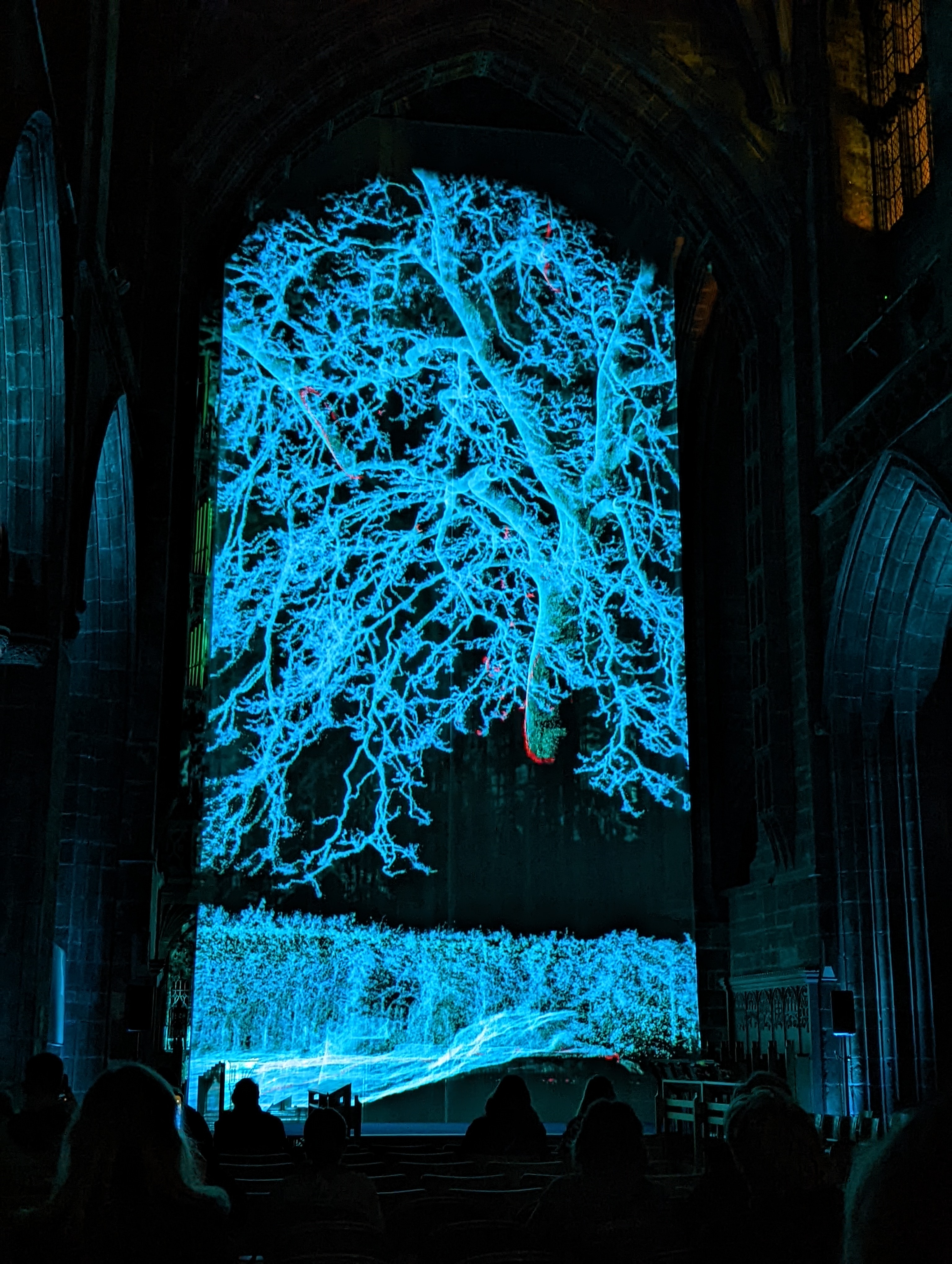 Visitors are then taken on a journey as first the stone pillars are formed and then eventually the full Cathedral. Golden toned images are drawn as if by some giant invisible hand, before gradually fading and merging into the next scene. The hyper realistic imagery based on 3D scans eventually builds into a full model of the Cathedrals floorplan which grows, rotates and then takes flight into the virtual sky. The art gives us insights into the building’s architecture, craftsmanship and layout, at various points taking you beneath the floor and inside one of the pillars. Later scenes of nature based on the surroundings of the Cathedral form, a tree forms, perhaps echoing God’s creation before a virtual bell tower tolls. Ghostly outlines fade into each other as the full Cathedral precinct is revealed, before then fading away once again. The closing water effects are mesmerising, suggesting the non permanence of everything in our world, washed away by the tides of time. For a different view of the installation stand behind the cloth near the choir stalls.