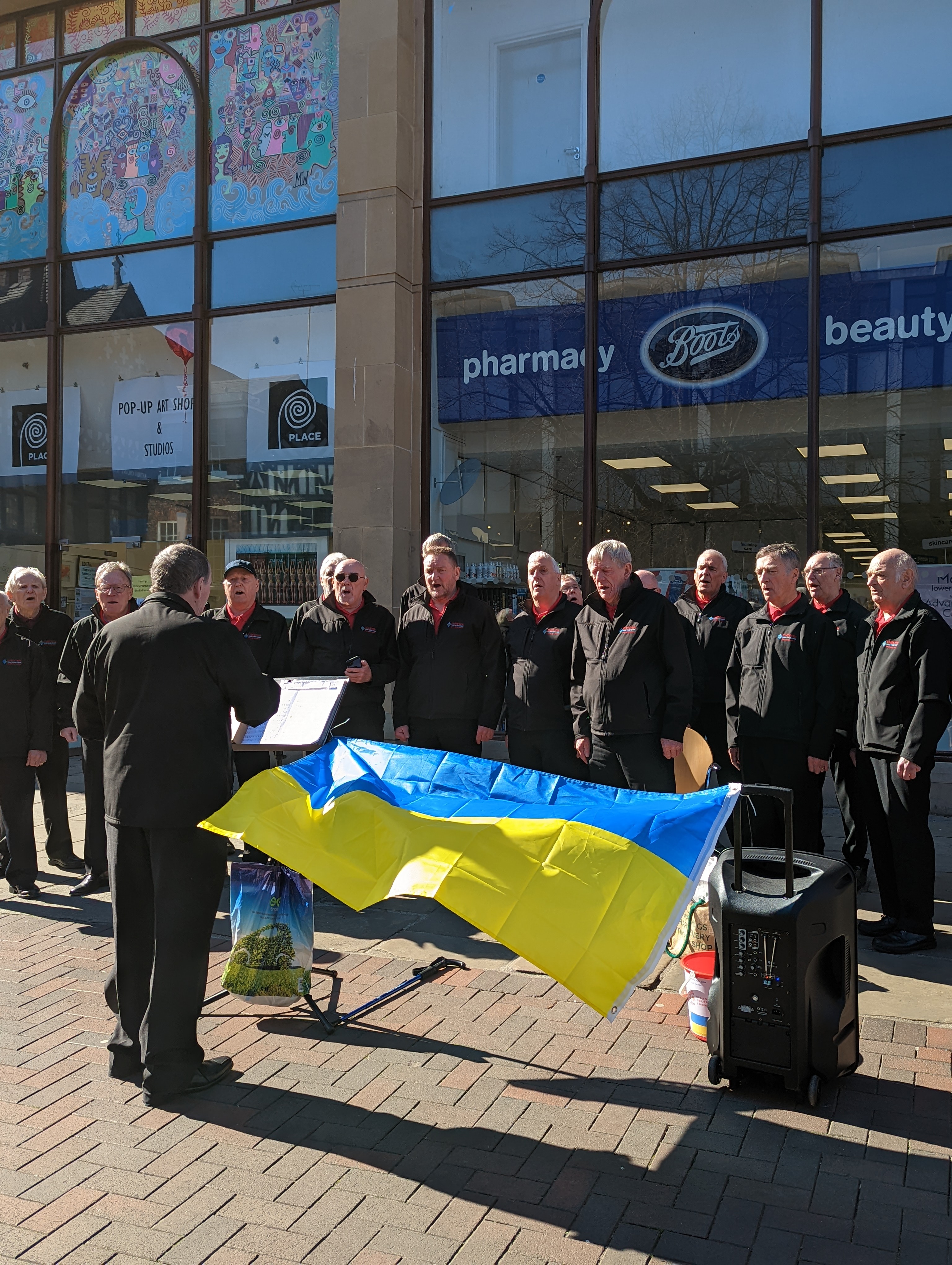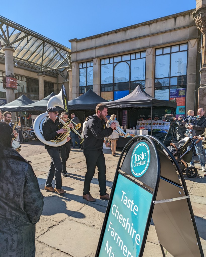 “Which over priced market is that today then?!” sneers a cynical dog walker as he walks past the ever popular Taste Cheshire market, bustling in the Town Hall square. He probably goes home to moan on the facebook about how the council need to lower the rates. Meanwhile the religious loudspeaker lot, another part of the Chester jigsaw promenade by the elephant statue wearing catchy high vis jackets declaring “The wages of sin are death”. They are soon drowned out by the arrival of the The King Brasstards a New Orleans themed 5 piece brass band who perform in front of the market. They are followed by the Chester Male voice choir, who perform in front of the pop up art shop/studio in the square, its upper window decorated with art by Mark Wigan. Raising funds for victims of the invasion of Ukraine, the choir who celebrated their 80th anniversary last year, perform with the now iconic yellow and blue in front of them. During a pause one of the choir, hands me a flyer encouraging me to join. When I reply that I can’t sing he smiles that “only about one percent of the population can’t sing!” Perhaps I could infiltrate the choir and write a blog. A voice behind me says :