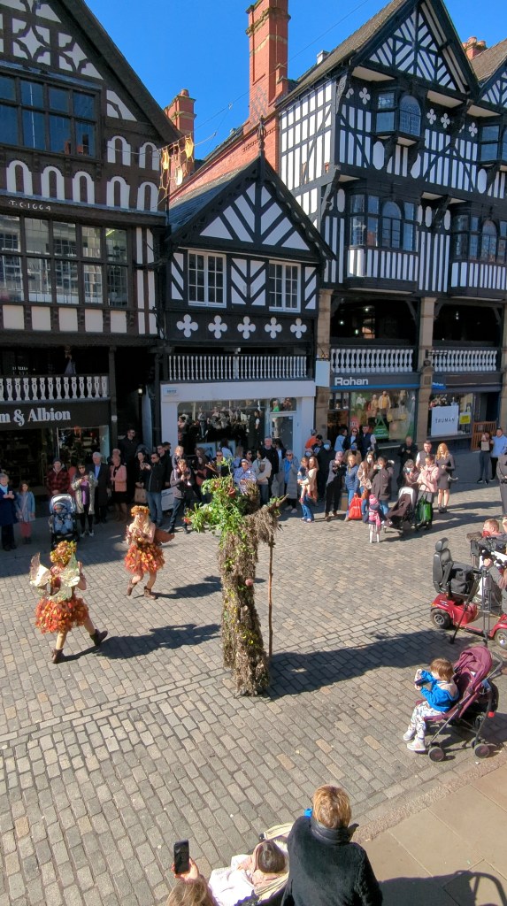 As ever the rows provide the perfect viewing platform. Its good to be back. Everything looks HD for the first time in a long while, the bridge street buildings that everyone takes for granted. The rows, found nowhere else in the world, perhaps at last seeing something of a revival, with ongoing restoration work and new businesses moving in. The new vintage clothes shop opening on Bridge street row, Bloom and Albion and the forthcoming Chester Pride cafe at ground level. Etc. I follow the performers back down Eastgate street as the tree folk hobbles down the steps into the former Liverpool shop for a break.