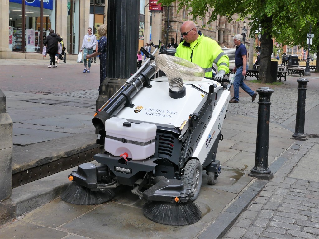 - As part of its drive to tackle the climate emergency, Cheshire West and Chester Council is now using electricity to keep streets across the borough clean, while being kind to the environment. The Council’s StreetCare teams are now using all-electric street sweeping machines for their day-to-day cleaning operations. The machines are charged overnight and then provide around 12 hours of cleaning time. Water jets, with added sanitizer, and circular brushes scrub away dirt, and the machine also has a jet washer attachment for hard to remove spots, plus a vacuum nozzle to suck up larger material. The Council’s Deputy Leader Karen Shore said: “As well as reducing our carbon footprint and being environmentally friendly, the new machine is very manoeuvrable and can easily fit through narrow alleys and passageways. The machine is also relatively quiet when it’s in operation, so it can be used in pedestrian areas without disturbing shoppers and visitors. This is particularly useful in the centre of Chester and our town centres. It really helps our teams keep the borough looking great for everyone to enjoy and we hope to add more electric equipment to assist our StreetCare operations in the future.”