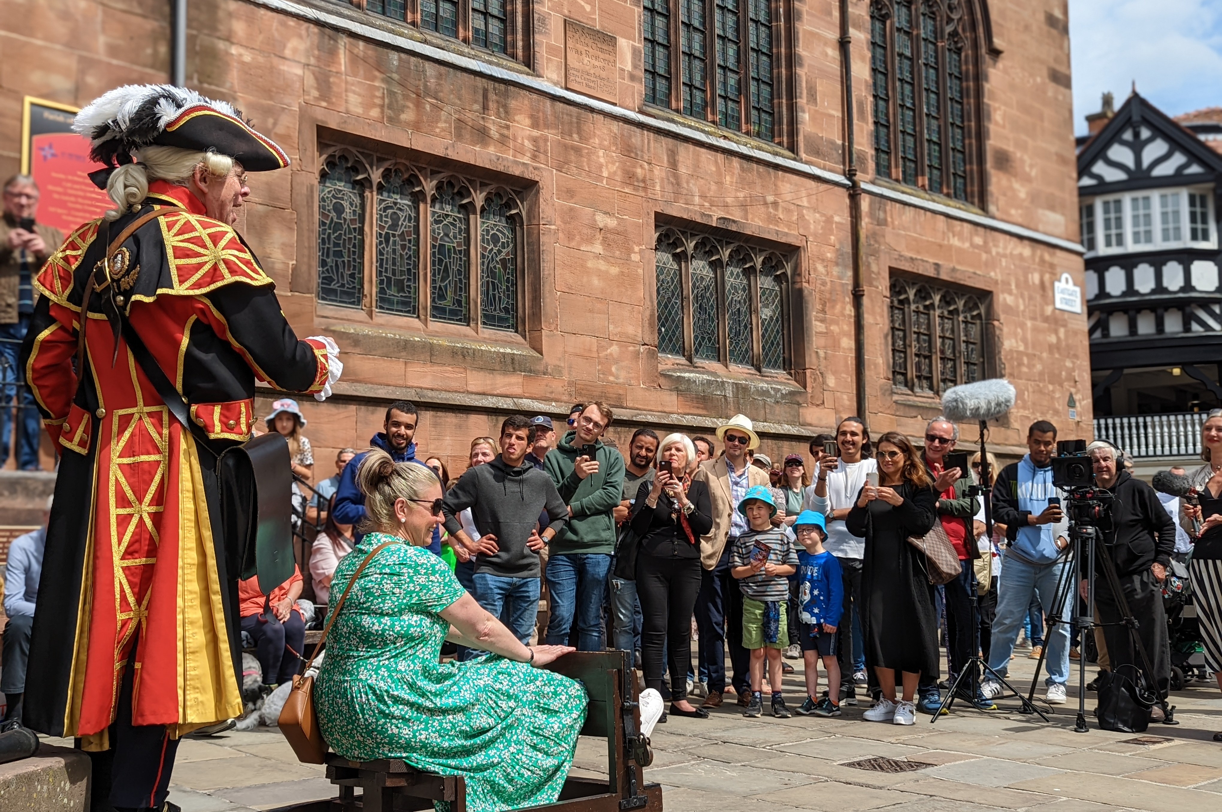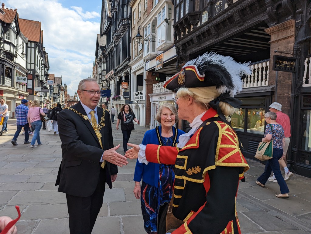 The new Lord Mayor Cllr John Leather arrives and mingles with the happy crowds. I ask him about the parade , he tells me that it is a military parade and the route isn’t being published in advance. “Are you local?” he asks me, unaware of my role in Chester. I resit the urge to say “Don’t you know who I am?” and smile to myself, knowing that I’ll soon be taking photos of him at city events. More crowds gather including a man in a Linton travel tavern T shirt. The Crier’s address draws a large crowd including many international visitors.