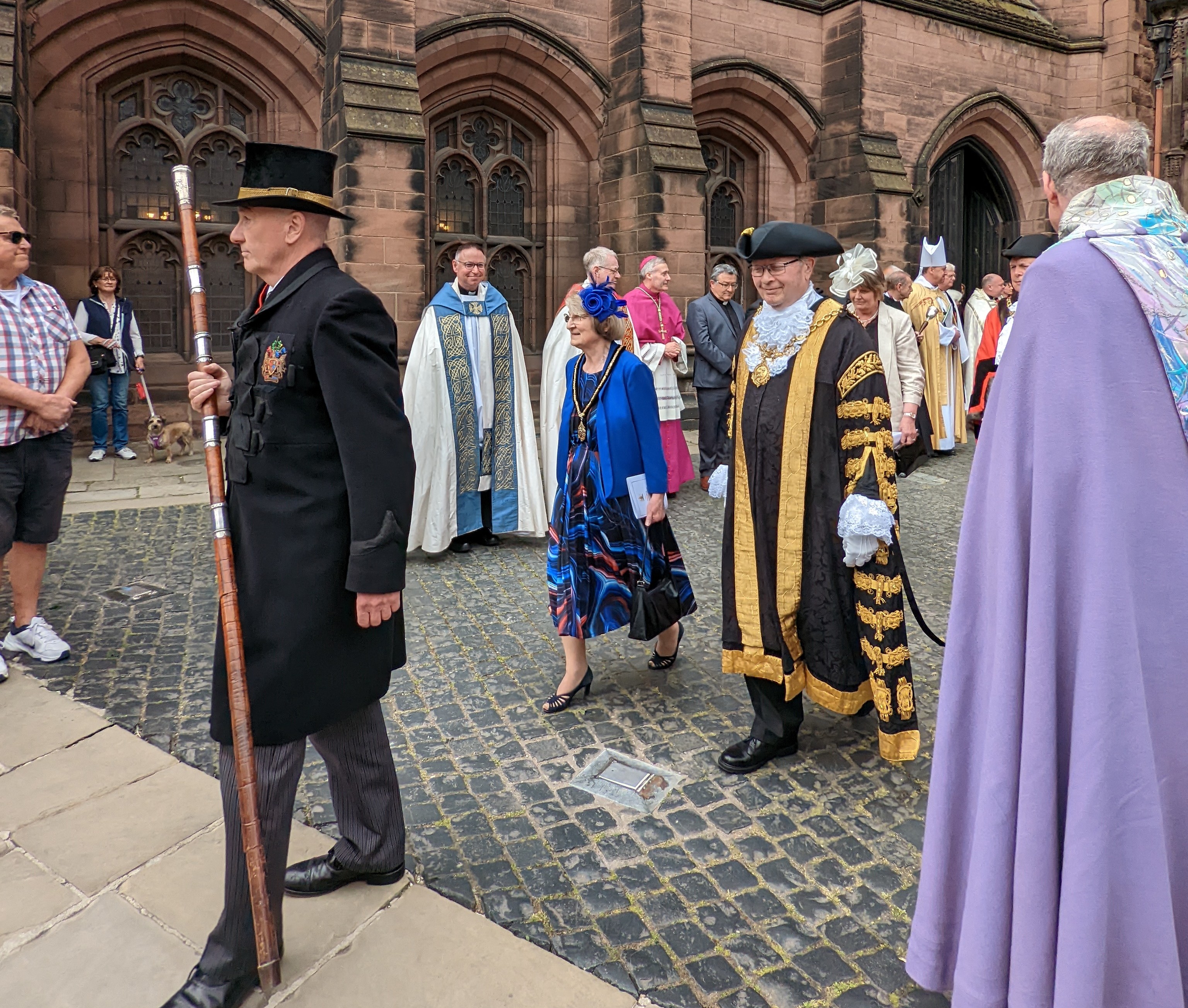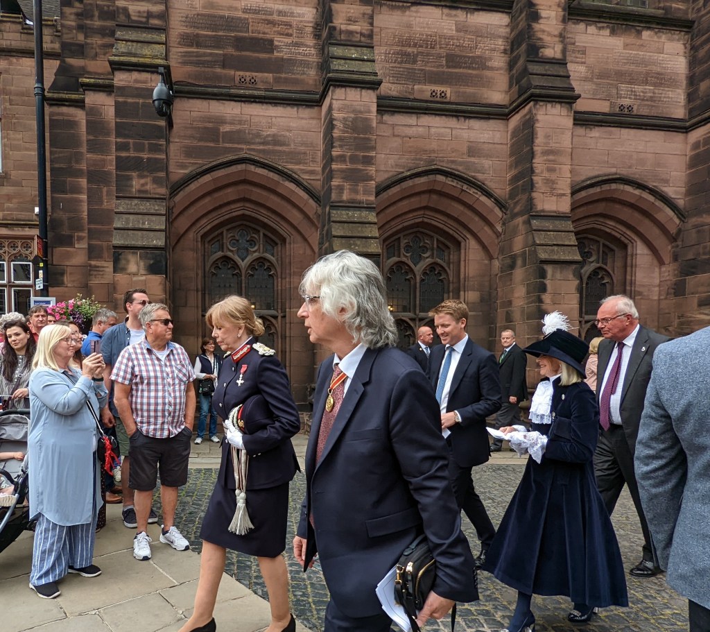 With a 3 hour wait until the parade I bimble around town for a while followed by a short break in Storyhouse. The buskers in Town Hall square in front of the apparently doomed Forum shopping centre have misjudged the mood with morose tunes from Les Miserables, empty chairs and anthems of death and misery. There is a high security presence in the city centre, with taped up bins and the Cathedral grounds closed for a jubilee service including a host of VIP guests. Crowds line up along St Werburgh street and around the town hall with a raised platform adorned with a large union flag. The music from the service plays through speakers, “Land of Hope and Glory” booming out optimistically. Then the Cathedral doors open and attendees of the service emerge. Phil Redmond, fresh from rejecting Wrexham’s city of culture bid and creating Hollyoaks 27 years ago is one of the first to emerge along with his wife Lady Redmond, the Lord- Lieutenant of Cheshire. I am unware of the Lord- Lieutenants role, but a later google reveals it involves representing The Queen in armed forces related duties. High ranking clergy, The Duke of Westminster ,Cheshire MPs, judges, members of the council file out, with others including Police Commissioner John Dwyer, who has probably forgotten about the time I asked who his favourite Batman was.