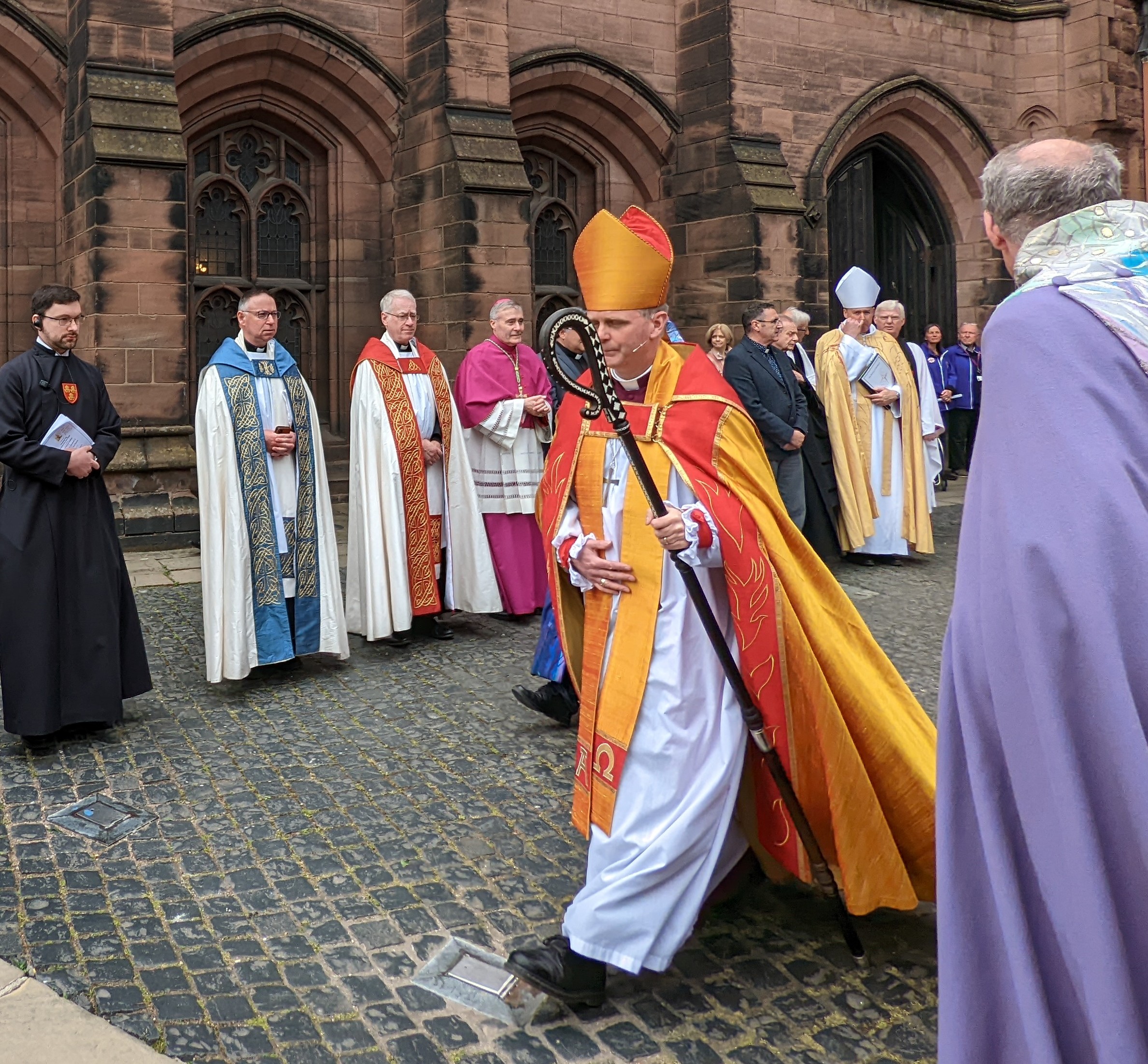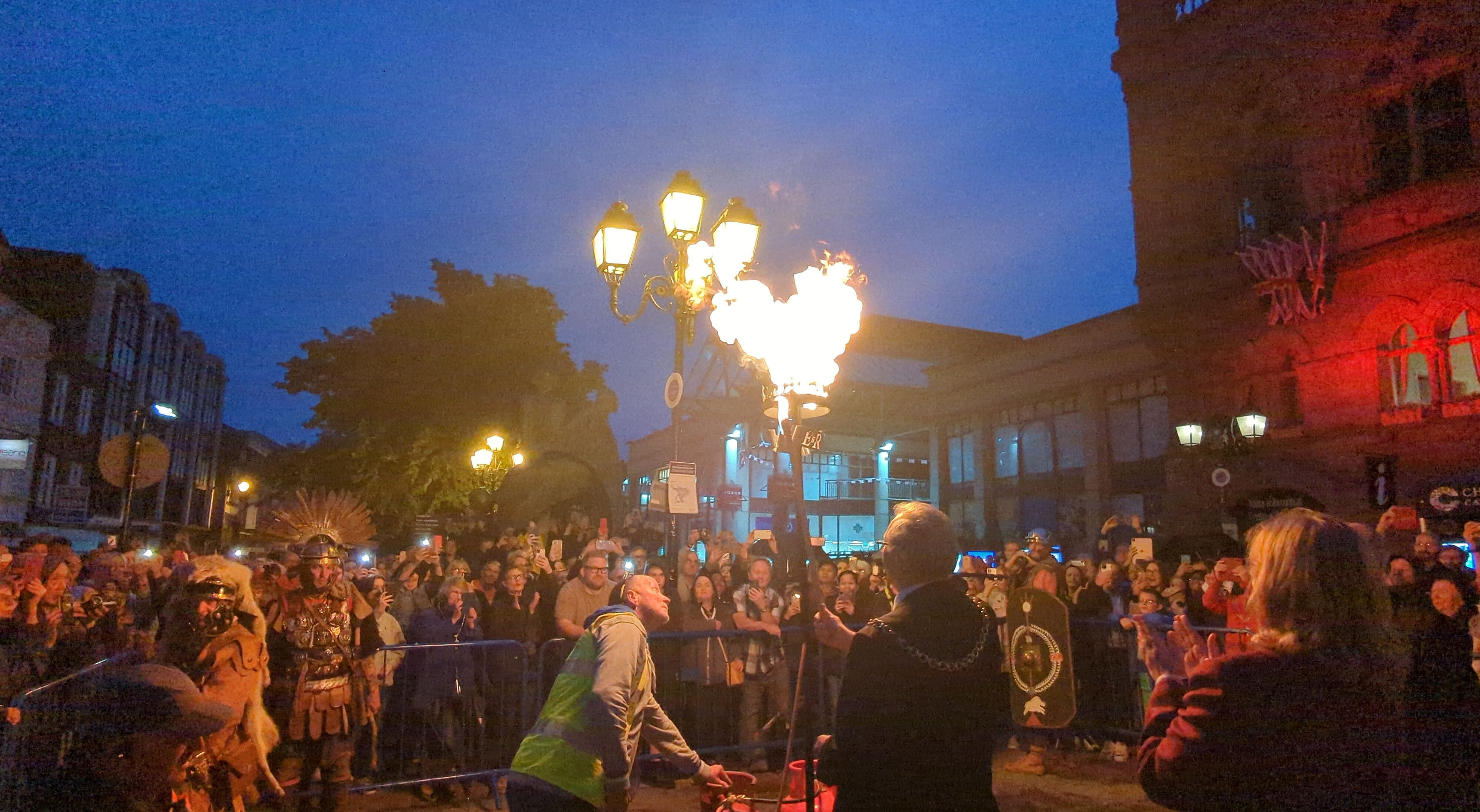 Mayor Leather , speaks from the stairs : ” Distinguished guests, ladies and gentlemen, Romans.. welcome to the lighting of our jubilee beacon. I’m grateful for the support this evening from the lord Lieutenant of Chester, Lady Alexis Redmond, Phil Redmond. The chairman of Cheshire west council Bob Rudd, Bishop Mark. and Dean Tim of the Cathedral. We recognise that beacons will be designed differently in the future involving less heat and less emissions, but we hope that between us we have planted enough trees under the Queen’s Green Canopy scheme to compensate for tonight’s emissions.”