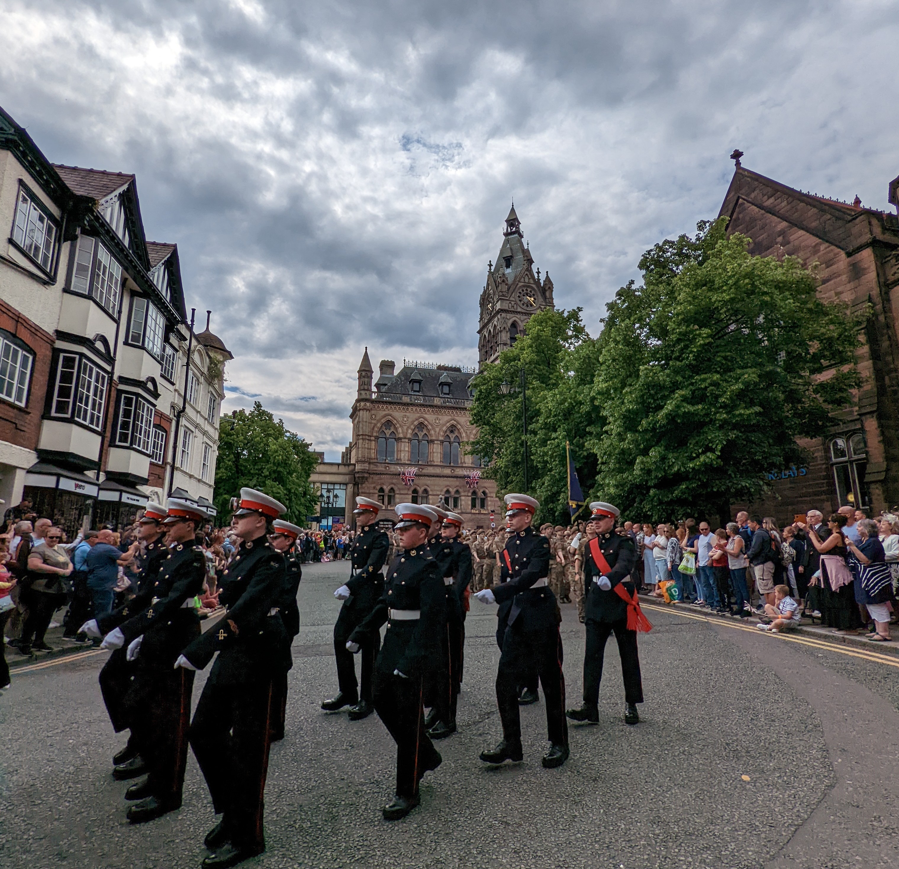 The military parade is a great spectacle, people clap as the soldiers pass by. I tweet throughout the event and soon it becomes clear that non everyone is in favour of the day’s events. The casual nasty remarks, and one tweeter sending me the same meme NINE times in response to coverage feels sour. But then again many people will be feeling sour given the problems the country currently faces. The Queen’s message encourages people to look towards the future with “confidence and enthusiasm”, which will certainly he tough for the hard core convinced Chester is on its last legs and things were actually better 70 glorious years ago. So there is a debate and a tension, which talk of unity only papers over: But do the Soldiers, dedicated to their country and prepared to die for their country, the scouts the sea cadets and Cheshire Fire and Rescue cadets deserve the bizarre commentary? No they don’t. Back in the real world away from social media, everyone watching enjoys the display of civic pride.