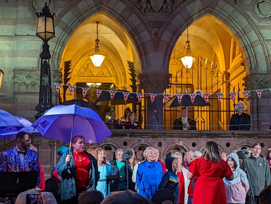 The evenings event kick off at 920 with a gathering in a rainy Town Hall square. Night is falling fast the Town Hall lit up in red white and blue and Matt Baker of Theatre in the Quarter, Chester Mystery Plays etc leads the festivities alongside the Jubilee choir. “It’s a very short event which is probably a good thing because of the rain, but the rain isn’t going to stop us!” he says before launching into a quick rendition of Singing in the Rain. City of Chester Brass Band , in their second appearance of the day are first to perform.