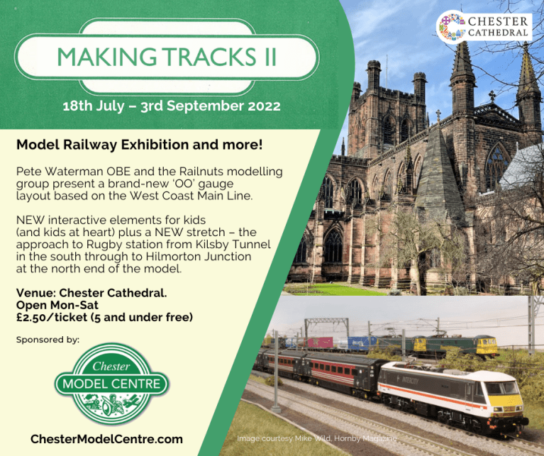 Following last years successful event, Making Tracks 2 is returning to Chester Cathedral from the 18th July to the 3rd September. The 64ft by 12ft model railway display produced by Pete Waterman OBE and the Railnuts modelling team features a different section of the West Coast Main Line.