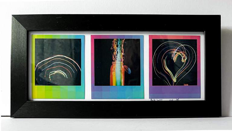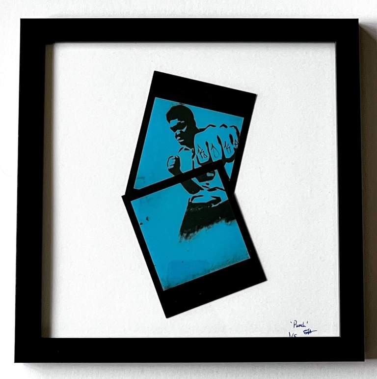 “The punch in blue and yellow duochrome film is a piece of street art I happened across in Manchester. While I was on a Mediterranean cruise I found street art fascinating as it was so prevalent in the places I visited, Barcelona, Rome, Marseille, Florence & Milan. I’d take pictures and spend hours later in the ships bar running then through different apps to create different effects. “ Two further images in the collection showcase support for the Ukrainian people: “I chose the obvious ‘peace’ sign and a back light shadow. I used the duochrone film from Polaroid to represent the colours present in the Ukrainian flag. The idea with these were to be, primarily visually pleasing outside of the political message of peace and lighter days are coming. It is my intention to donate a portion of each sale to the Red Cross Ukraine Crisis Appeal. ” Donations will be made from sales of the LGBT themed art to the Albert Kennedy Trust and trains charity, Sparkle.