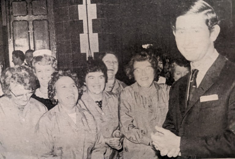 The Royal parade continued onto the city walls. The Prince waved to children watching from the Convent School (now the dreaded Dee House), and then headed to County Hall. The Prince “paused for a moment to assure himself that the staff were paid sufficiently. One of the shorthand typists, Jacqueline Welborn was thrilled by the Royal visitor’s interest”. Meanwhile two telephonists, Mrs S Travers and Mrs I Jenkins were impressed by the brief encounter saying that “Its just by chance he’s been born into Royalty, but theres something different about him.”