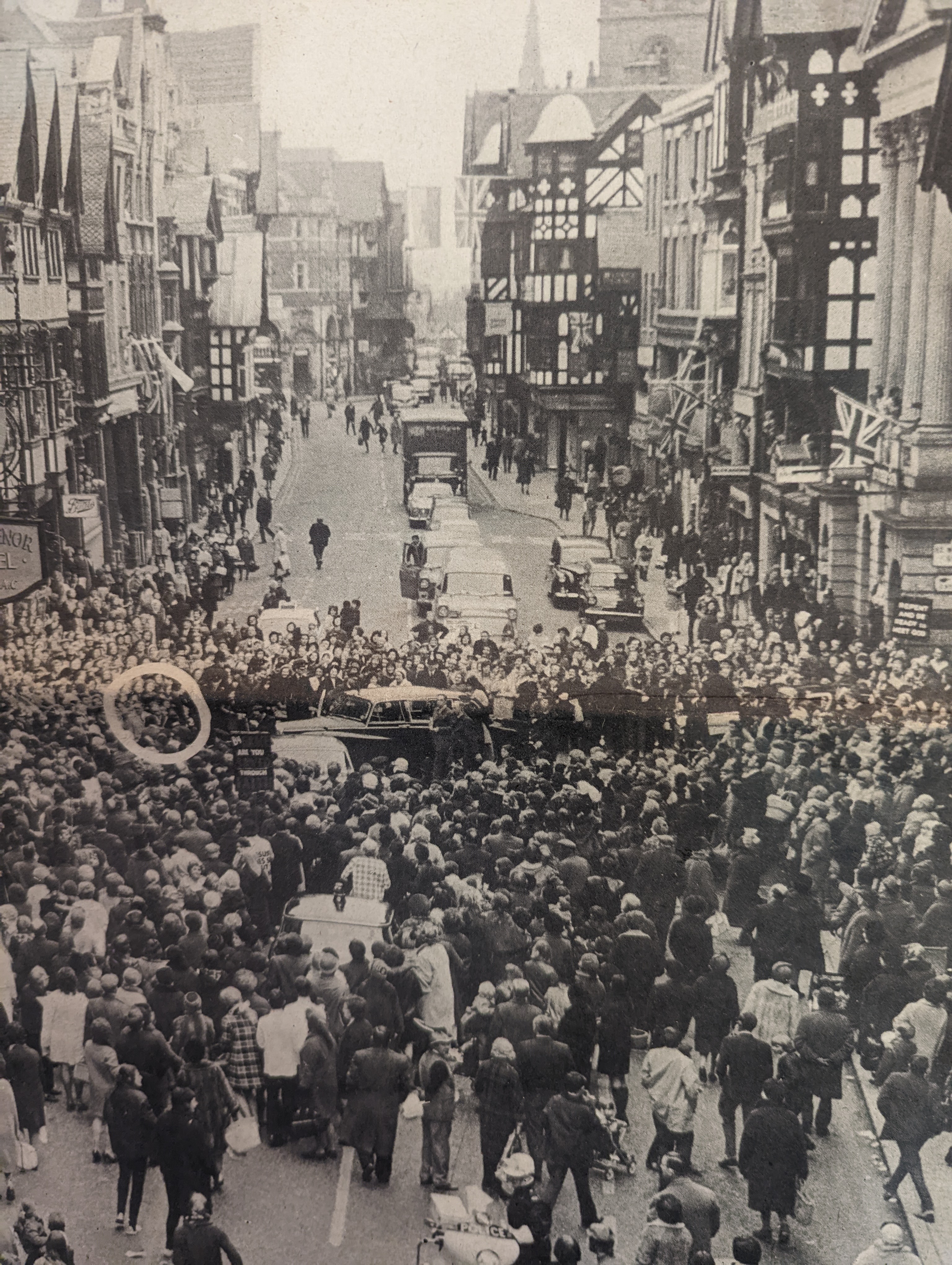 On the 5th Feb 1971, the Apollo 14 mission achieved the third manned lunar landing, George Harrison’s My Sweet Lord was number 1 in the charts, Love Story won Best Picture at the Golden Globes, and Prince Charles, aged 23 brought “happy smiles” and “high elation” on a visit to Chester , his first appearance as Earl of Chester. The occasion was marked in a special souvenir edition of the Cheshire Observer. This 50 year old eBay treasure illustrates the historic day which is said to have left police and civic leaders “gasping”.