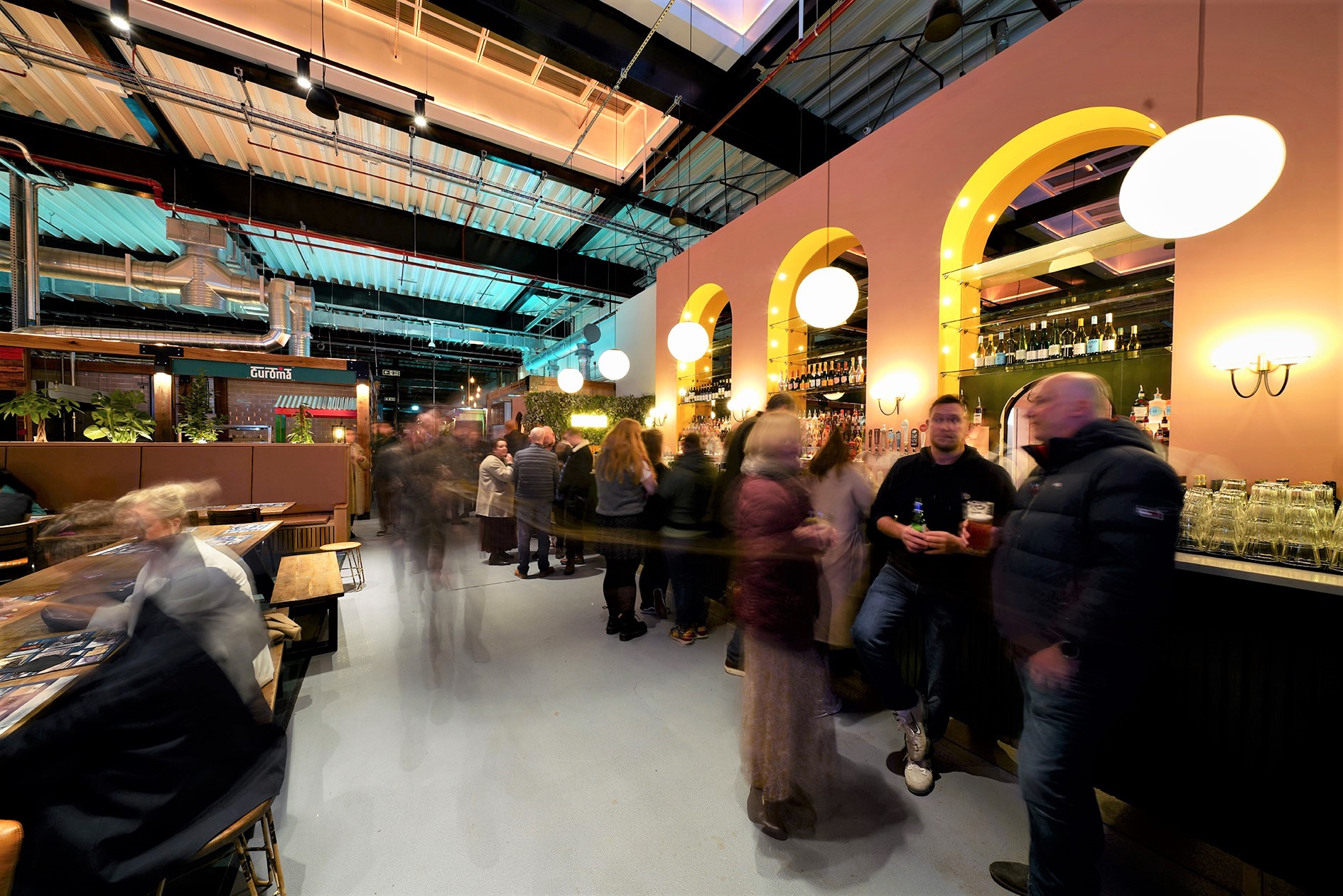 The new market replaces the market which had been located in the Forum since it opened in 1967. The council say that “around half” of the existing traders made the move to the new market, with many popular traders deciding to move to high street premises. The driving force behind the new market has been to create a ‘modern traditional market’ that takes the best of the new breed of thriving city produce markets such as Borough Market in London, or Barcelona market; combined with pioneering communal food hall markets in Altrincham and Stockholm, to create a unique blend of produce, goods, food and beverage traders in a welcoming and inclusive space for everyone to enjoy – where you really can shop local and eat global. The design of the market was guided by extensive consultation with residents and traders prior to construction to ensure it could be fit for purpose, adaptable and sustainable.