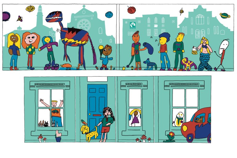 To generate ideas and images for the Ellesmere Port murals, Nikki ran a drawing workshop in Theatre Porto working with a group of local children. The artwork created was inspired by two themes, ‘magical market stalls’ and ‘what makes you happy’. Nikki and Graham re-drew these images with additional elements resulting in a series of artworks which are being painted on shutters and walls around the market.