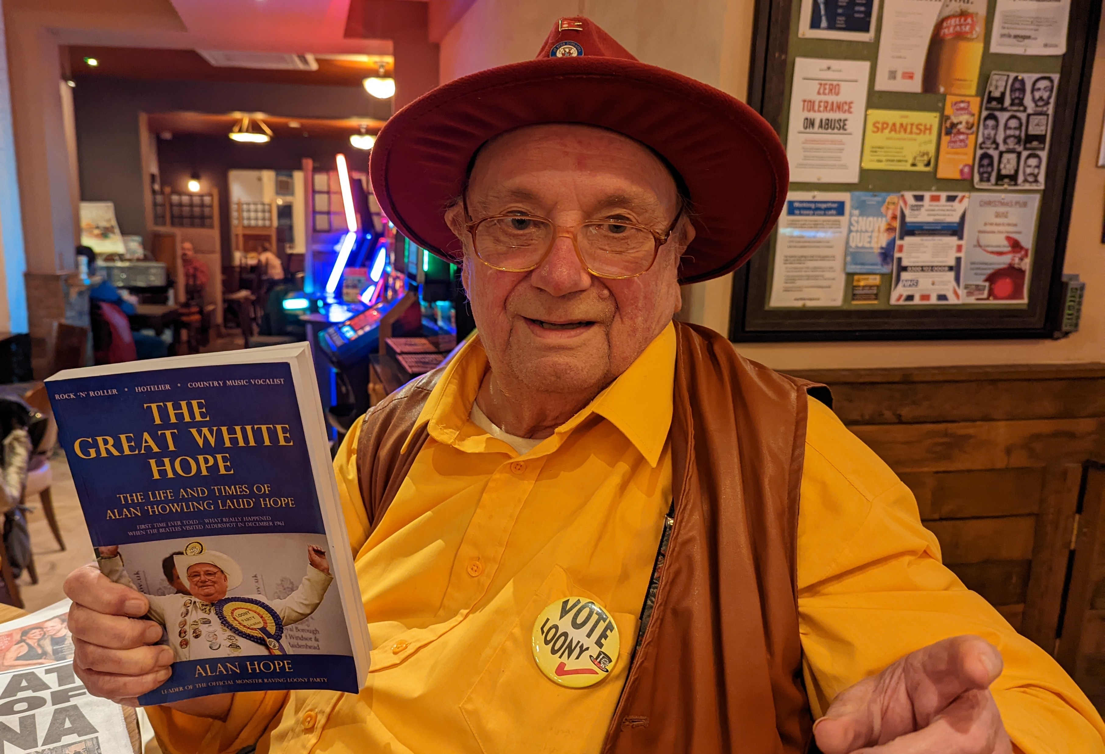 With Keir Starmer and Rishi Sunak nowhere to be seen in Chester this election, the longest serving British Party Leader Alan “Howling Laud ” Hope is the Official Monster Raving Loony Party candidate. The experienced politician spoke to us from his campaign HQ in the Bull and Stirrup.