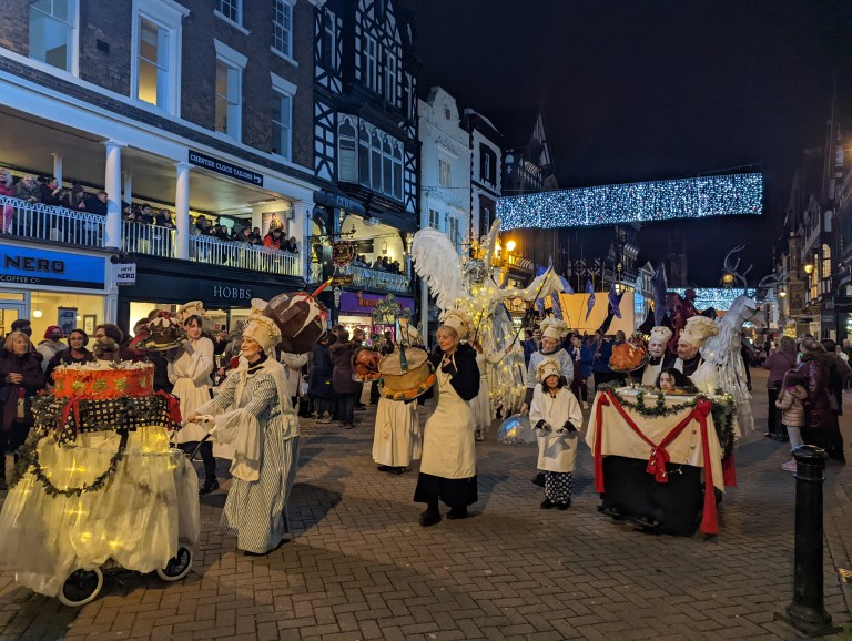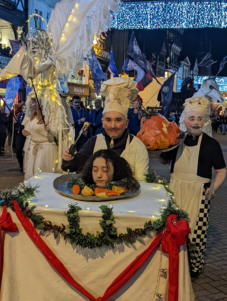 The Winter Watch parade features Jack Frost, an Angel, Fire Skeletons, Dragon, Ice Queens, Devils, Cooks with their Victorian Christmas Dinner led by Chester’s Karamba Samba dressed as a ghost band.