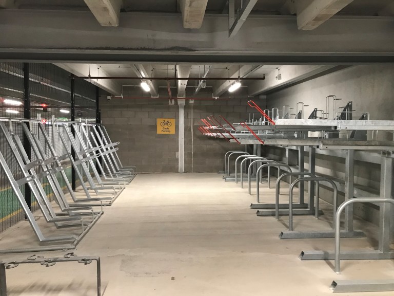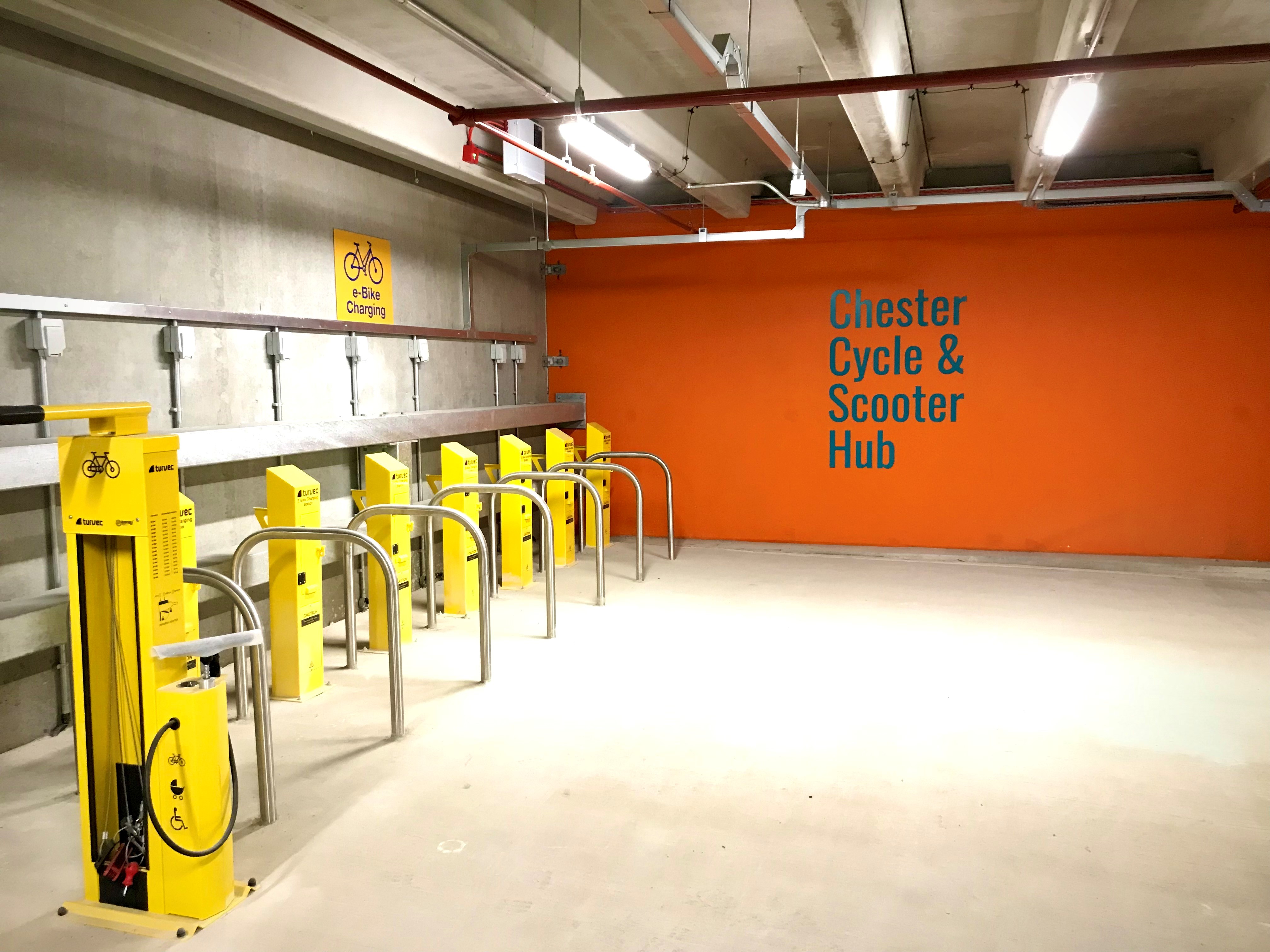 Following a successful bid to the Council’s Climate Emergency Capital Fund, the indoor Cycle Hub has been incorporated into the entry level of the new Market Parking on Hunter Street multi-storey car park. constructed as part of the new Northgate Phase 1 development in Chester city centre and which opened in late October.