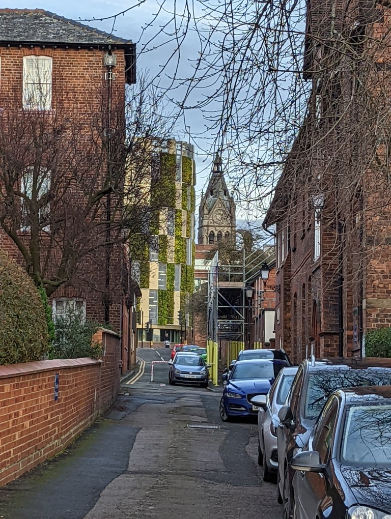 I turn the corner past the rarely open King Charles’ Tower and look out across the canal to George Street, considering how this areas has changed in the last decade- the Delamere Street medical complex and the car park, the Escape rooms, the pocket park, the new bus interchange in the distance, its green roof visible amongst the patchwork of rooftops. Past Hanoi Social on the walls (in the old Hypha unit) I head down the steps to Rufus Court. In the lonely courtyard, I notice that Sunrise Patisserie, maker of Portuguese tarts are taking over the old Doughnut Whisperer shop, and feel a nostalgic twinge at the closure of Tri-active, once ShitChester HQ.