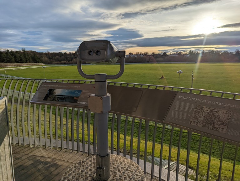 A pair of special binoculars overlooking Britain’s oldest racecourse flanked by 2 information panels promise a trip to the past via specially created visuals charting the changes in the area when it was once one of the busiest ports in Britain. “These are no ordinary binoculars” says the information panel , in fact they haven’t worked for 5 years or so- getting this repaired would be an easy fix for our tourist offering- either that or removed the sad looking thing.