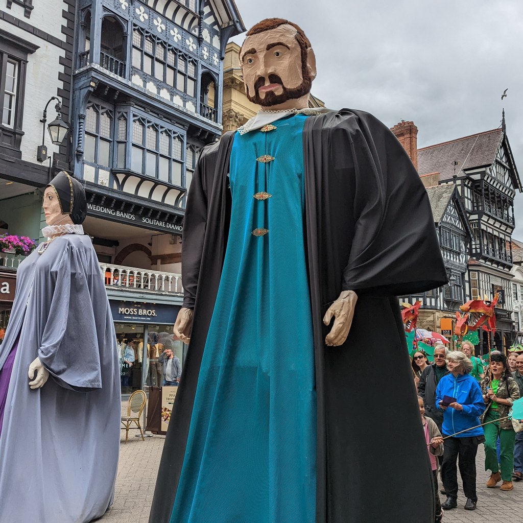 The Summer Watch was originally performed by the City Guilds at Midsummer. It was disbanded in the 1670’s before being revived in 1989, featuring the Chester family of giants. The Midsummer Watch ‘Family of Giants’ the father, mother and two daughters are towering four metre figures.The parade is led by the City Guilds and Chester’s Karamba Samba Band, with dragons, angels, pirates, the Chester ravens, unicorn, stag, hobby horses, St Werburgh (and her geese), green men, Balaam’s Ass, Cernunnus the Celtic lord of the forest, and a devil Band.