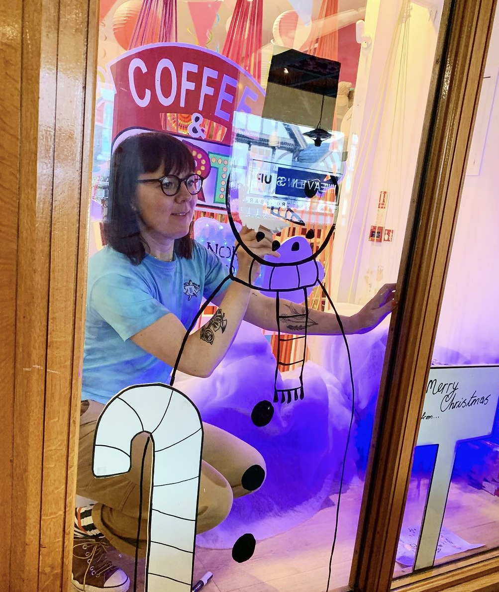 The new Christmas trail will be in place until the 31st December and has been designed to match the needs of the businesses, taking their input on board with the aim of encouraging people up onto the rows to explore and search for the hidden elements. There are 10 windows to find and 2 bonus windows, with some of the art also found inside the businesses. ” The great thing is I got to use all my art skills. I’ve been painting, using graphite, acrylics. It’s the most fun project I’ve ever done. ” Of the growing community of creatives in Chester she says :