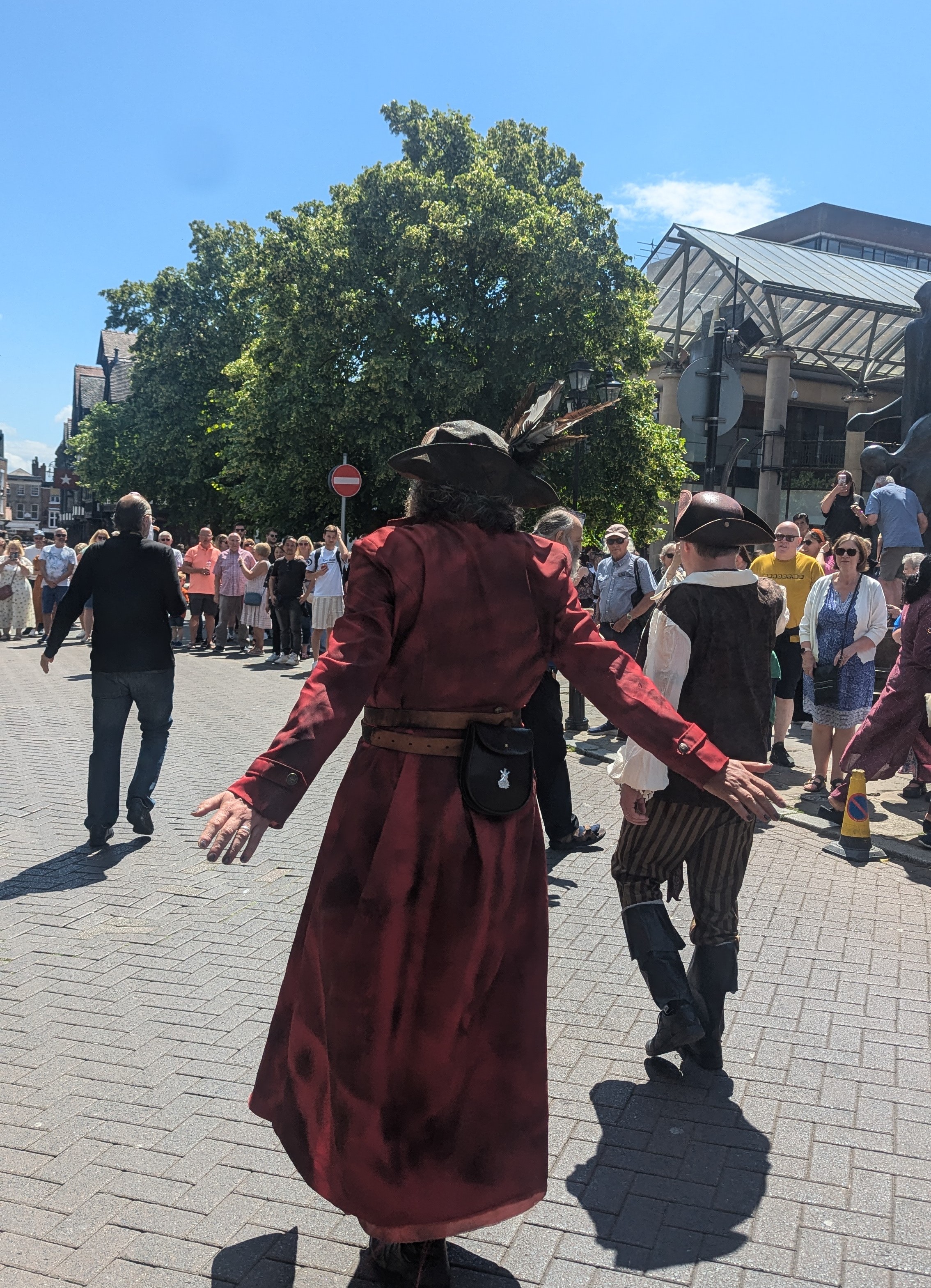 “I can hear drums!” I say. Soon the samba drums are beating in front of us, followed by a riot of colour and creativity. The compact city streets serving as a perfect backdrop, almost as if history planned it this way. A tricycle with 3 angels on horseback, the Lord Mayor pulled along on a chariot, a guest appearance from the local plague doctor, a dragon, a devil band. Part of the fun is spotting people you know taking part. The pirate ship takes up the rear of the procession to cheers and waves from the happy crowds that line the streets and the rows.