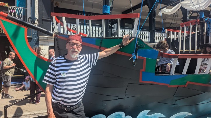 “Ship coming through!” says the pirate Captain Mark Williams as he guides the newly built pirate ship down Northgate street.