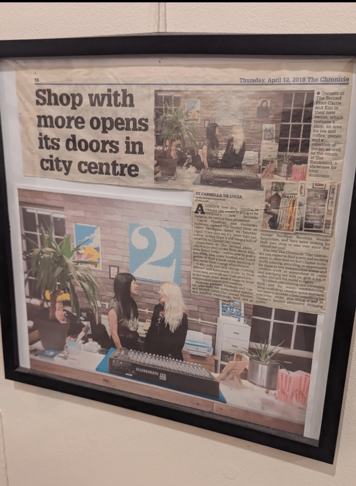 Carrie commented : “It’s the end of an era. There were so many versions of The 2nd Floor; the gigs, the workshops, the local artists, the hangout, the shop… We adapted constantly & loved curating a space for the people of Chester. I really hope folks will hold fond memories of what The 2nd Floor brought to the city & how special a place it was. The independents of Chester are what make it such a vibrant place so we’d love for everyone to continue following & supporting us in our future adventures.” Thank you to Carrie and Kim for all their support over the years, to myself and the Chester community.