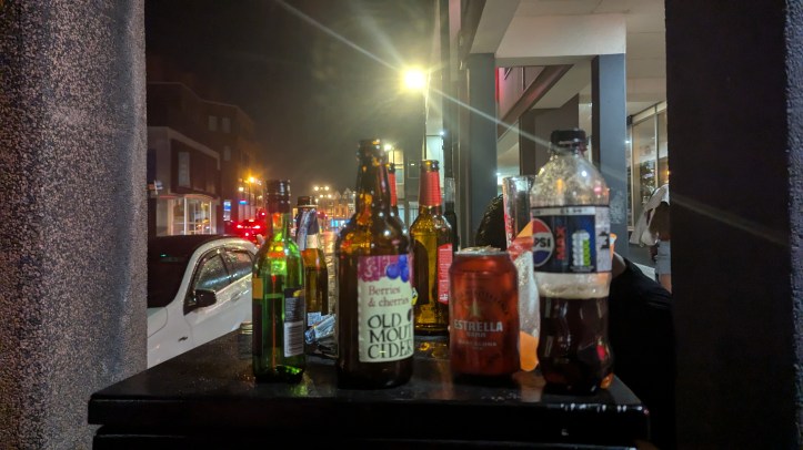 “The weather’s a bit crap innit!” says a police officer stationed in a van at the end of Watergate street. We head back towards the Eastgate, pausing to pick up an abandoned bottle of Kopparberg..
