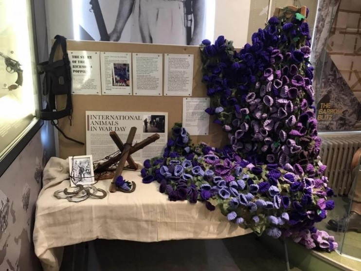 Cascading purple poppies commemorating the role played by animals in war will be on display with traditional red poppy highlights at Cheshire Military Museum from November 7th. The New temporary exhibition, including the purple poppies, honours the role animals and birds played in WWI and more recent conflicts. The Exhibition brings together stories of horses, donkeys, mules, dogs and pigeons through writings, poetry and artwork and artefacts.