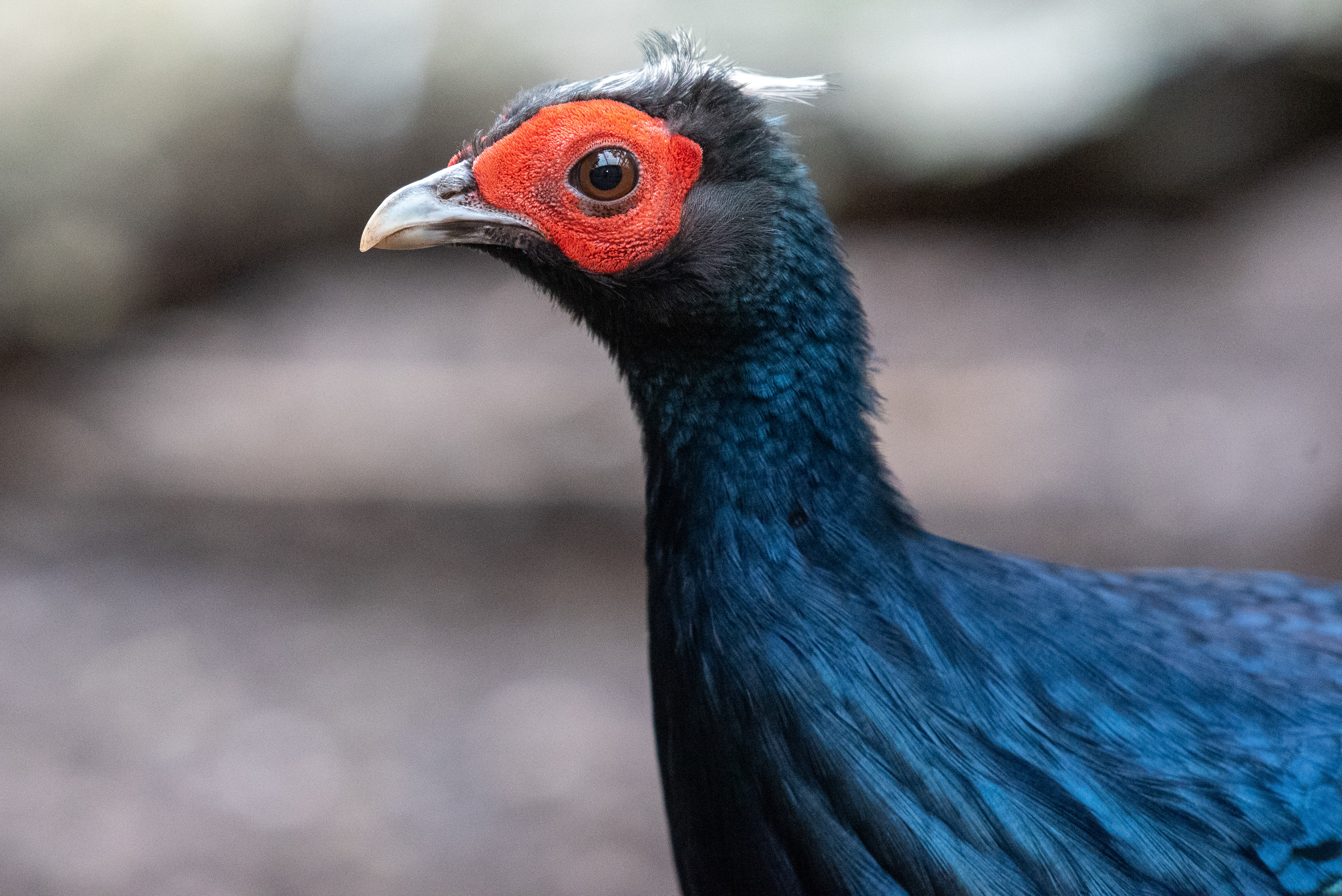 Males of the species have dark blue, iridescent feathers, a short white crest and distinctive red caruncles (fleshy patches) around their eyes, while females have rich brown feathers. The pheasants at Chester Zoo can be found in an aviary close to the Chimpanzees and another not far from the snow leopard habitat.